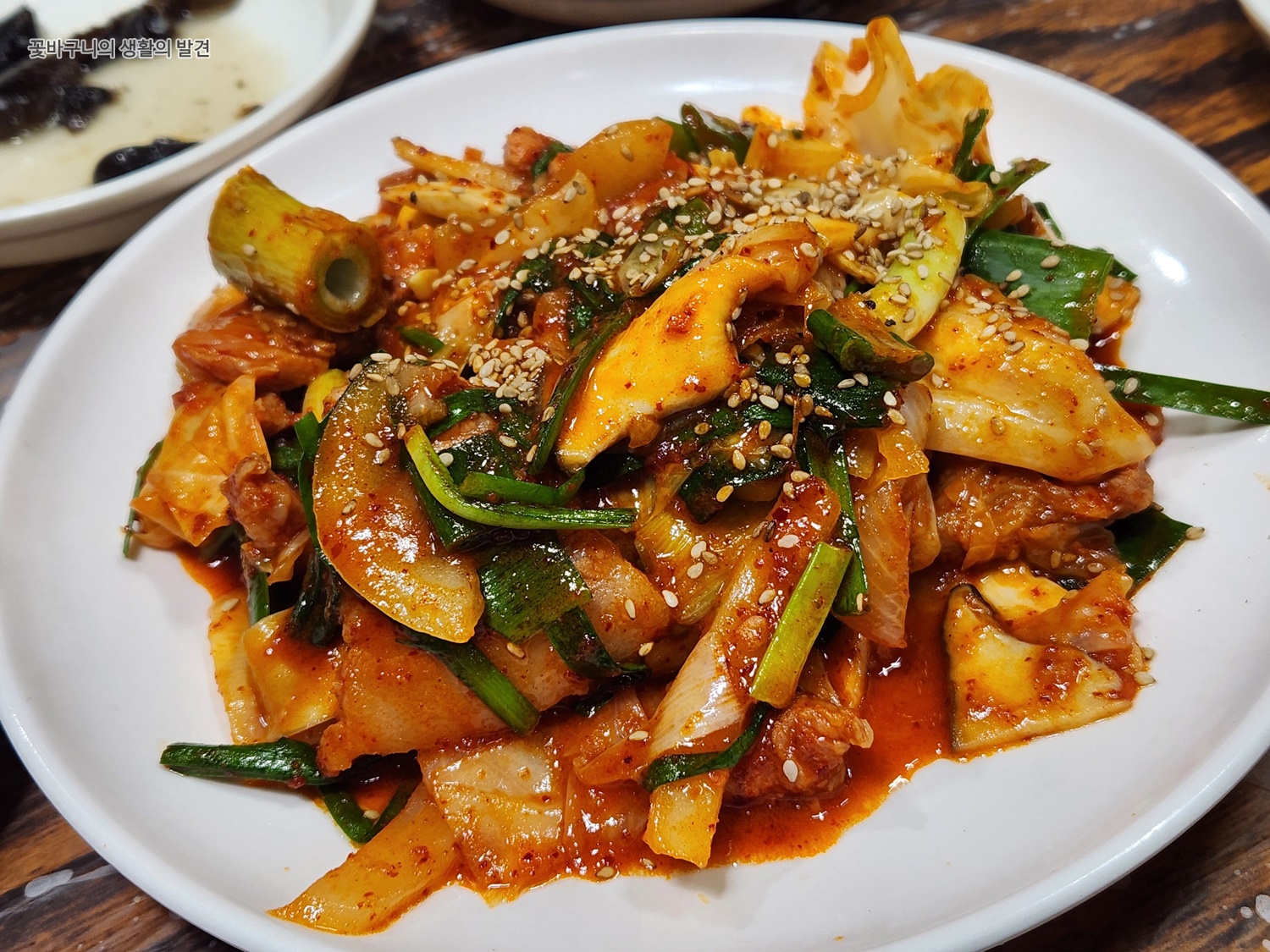 싱싱한 채소가 있으니 그냥 먹기는 아쉬워 제육볶음도 주문해 보았습니다. 국내산 돼지고기를 사용한다고 해서 더 믿음이 갔는데 채소를 듬뿍 넣어주셨는데 큼직만 한 돼지고기가 잡내 없이 맛은 좋았으나 고기양이 살짝 아쉬워 두부전골에 살짝 밀리네요,, 개인적으로 두부전골 주문하길 참 잘했다 생각 들었습니다.