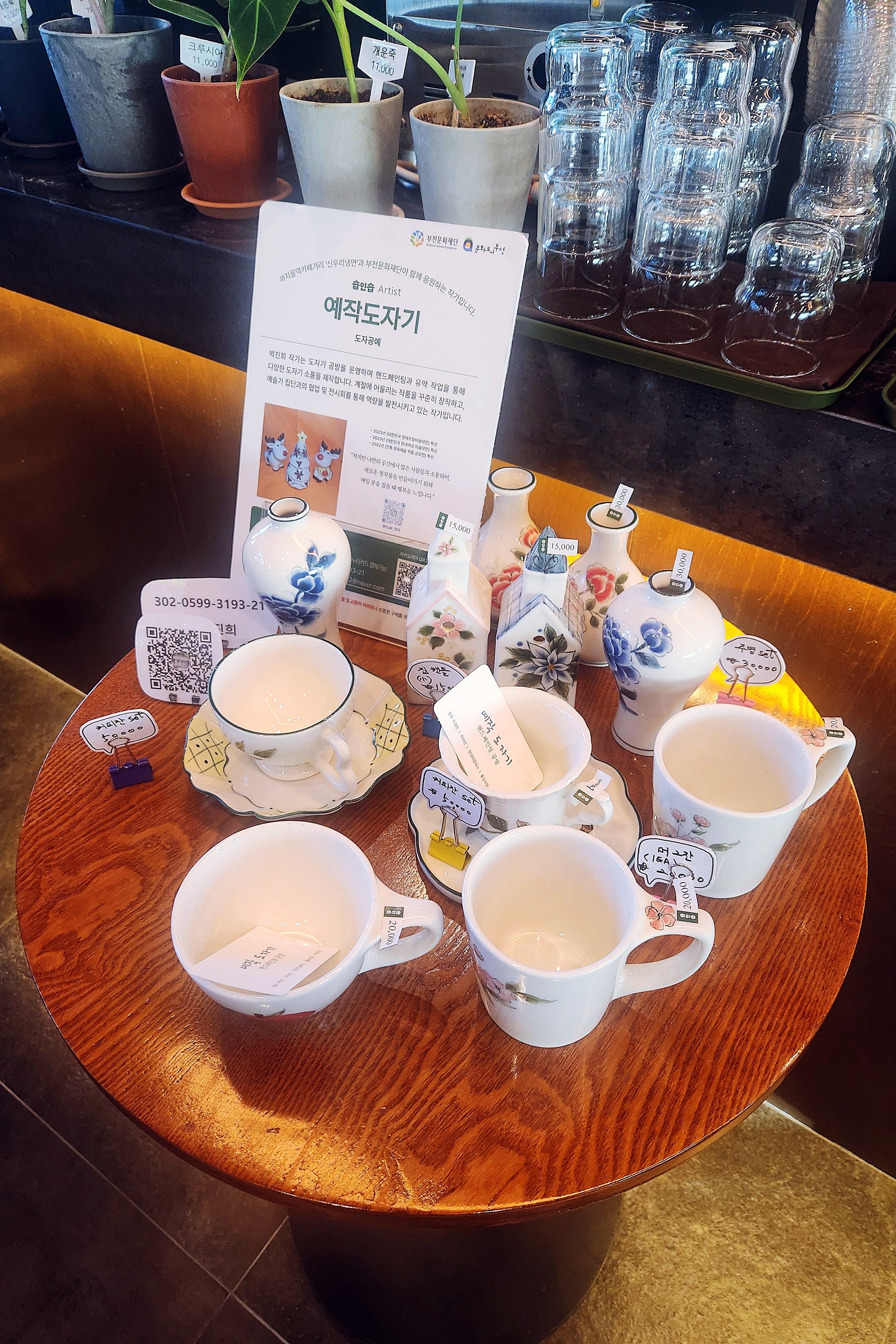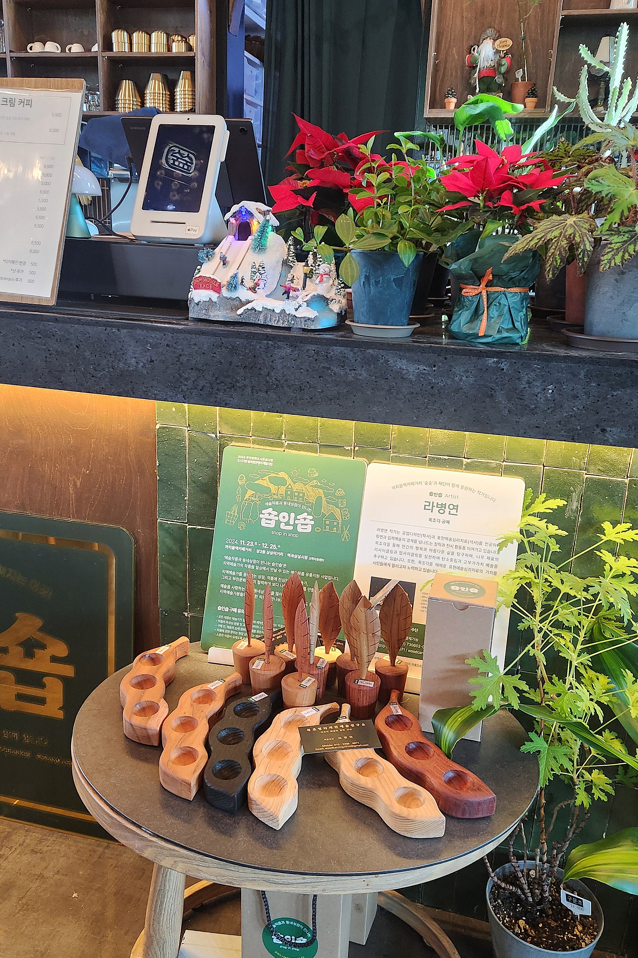 예작 도자기의 귀여운 도자기 소품과 목공예 라병연 작가님의 숍인숍으로 소개되어 있었습니다.