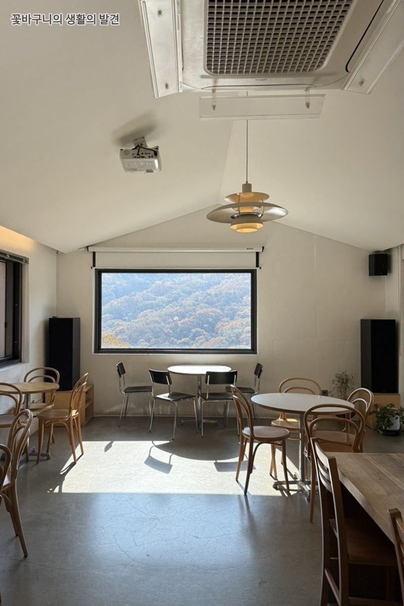 2층으로 올라가니 탁 트인 시야로 남한산성 전체 전경을 조망 할 수 있었습니다. 미니멀한 실내로 오롯이 창밖의 자연에 집중할 수 있는 곳이었습니다.