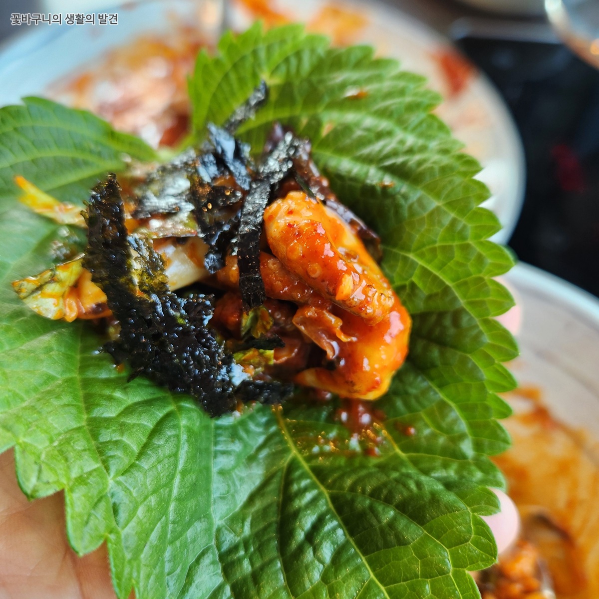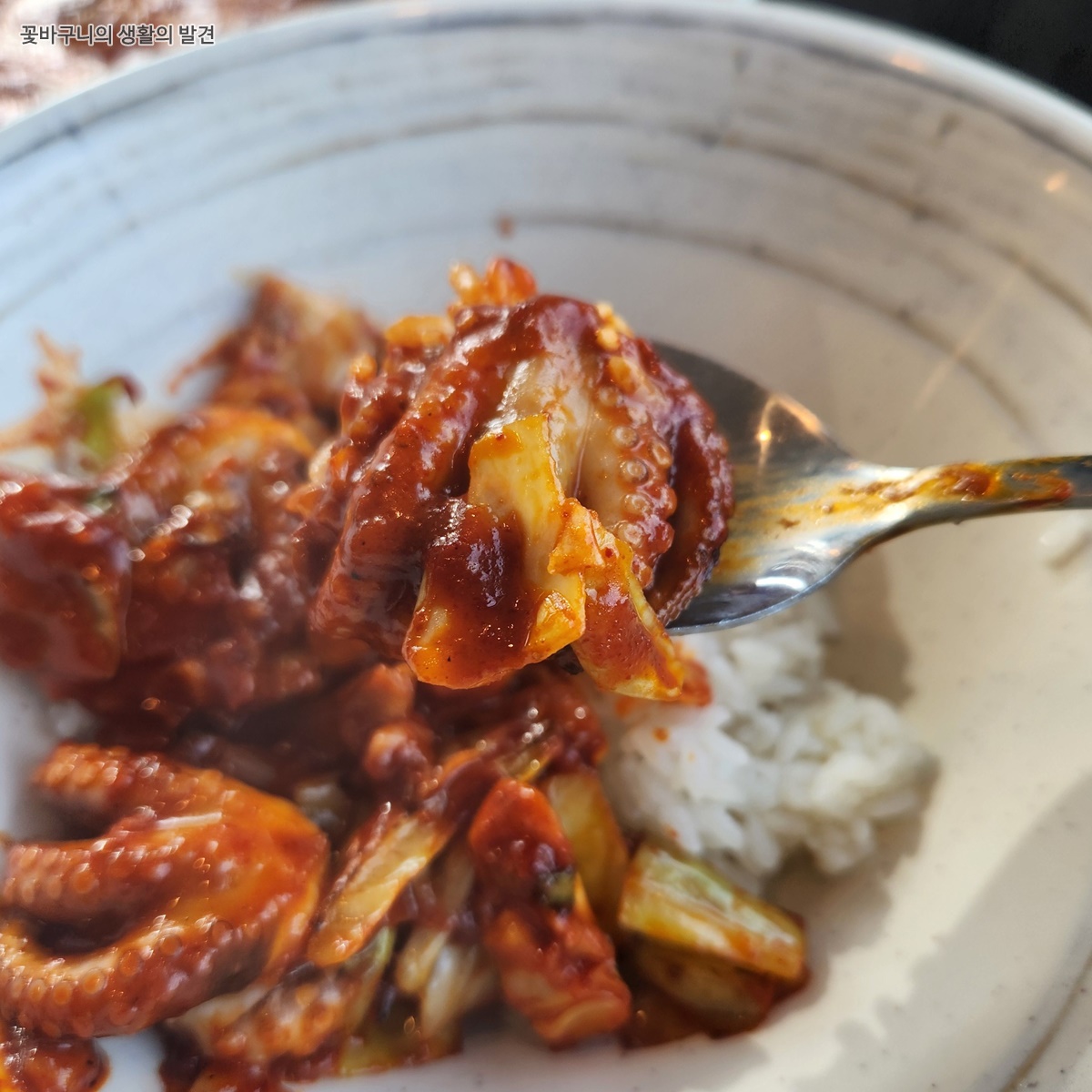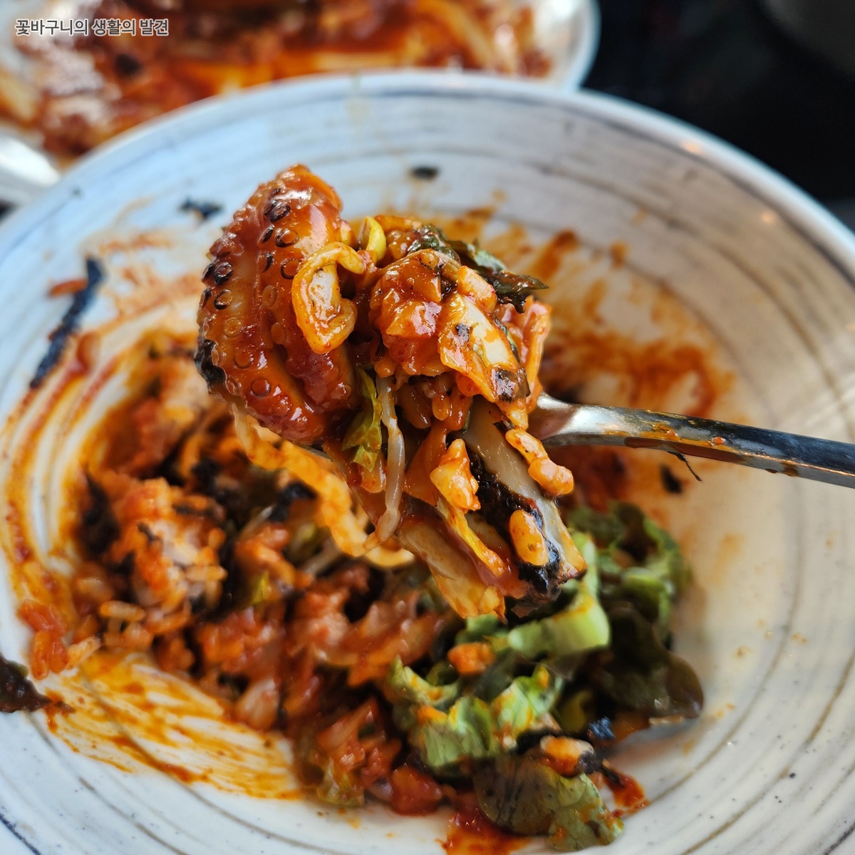 밥과 비비기 전에 주꾸미부터 맛보았는데요, 직화 주꾸미는 불향이 가득했고 입안 가득 퍼지는 매콤함이 일품이었습니다. 한입 베어 물면 탱글탱글하고 오동통한 살이 씹히는데 전혀 질기지 않고 쫄깃하면서도 부드러운 주꾸미입니다. 양념이 주꾸미 속까지 잘 배어 있어 씹을 때마다 감찰맛이 폭발하는 듯이 그야말로 밥도둑입니다.