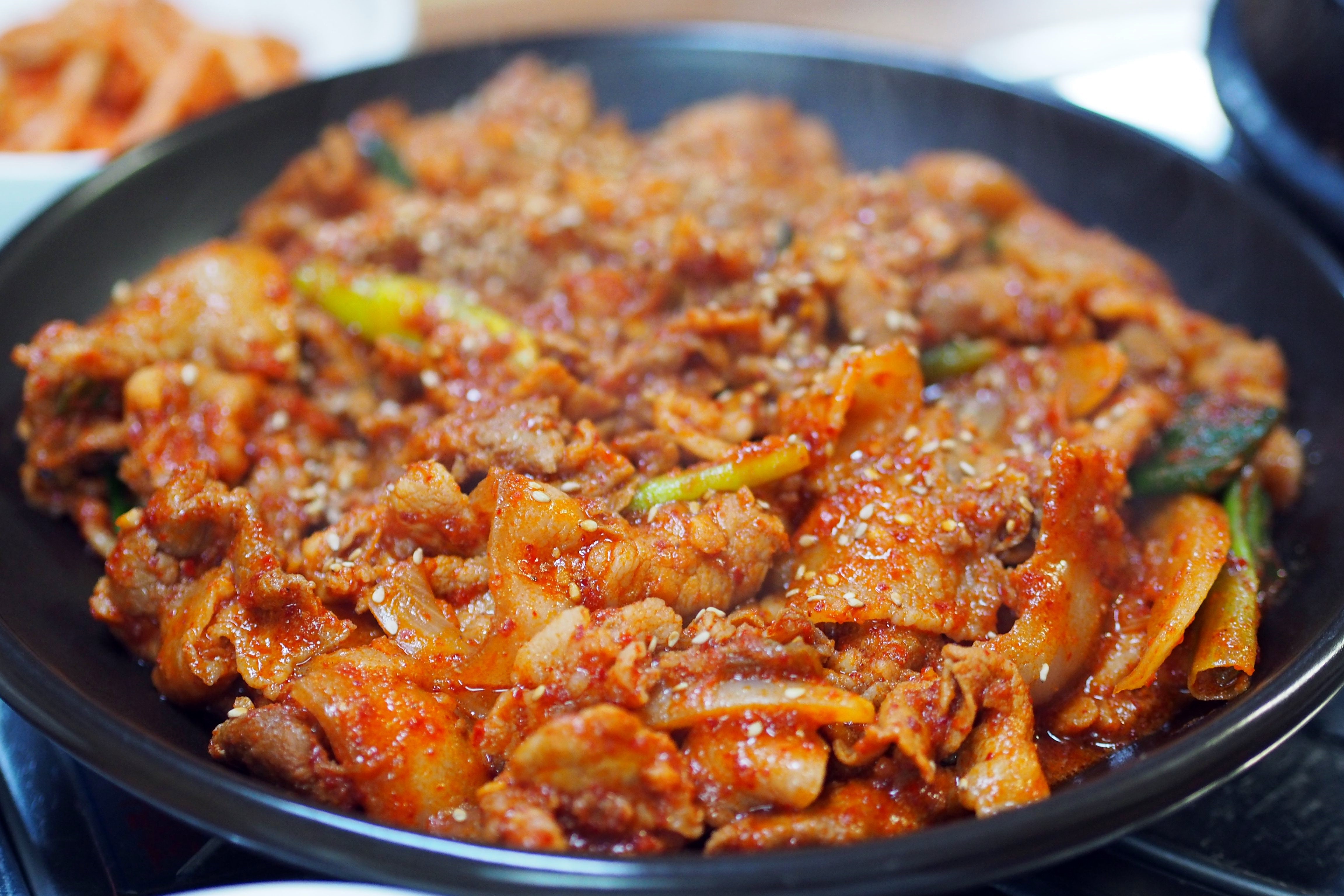 4인자리에 앉으니 바로 제육볶음이 나왔습니다, 보기에도 먹음직스러운 제육볶음입니다.