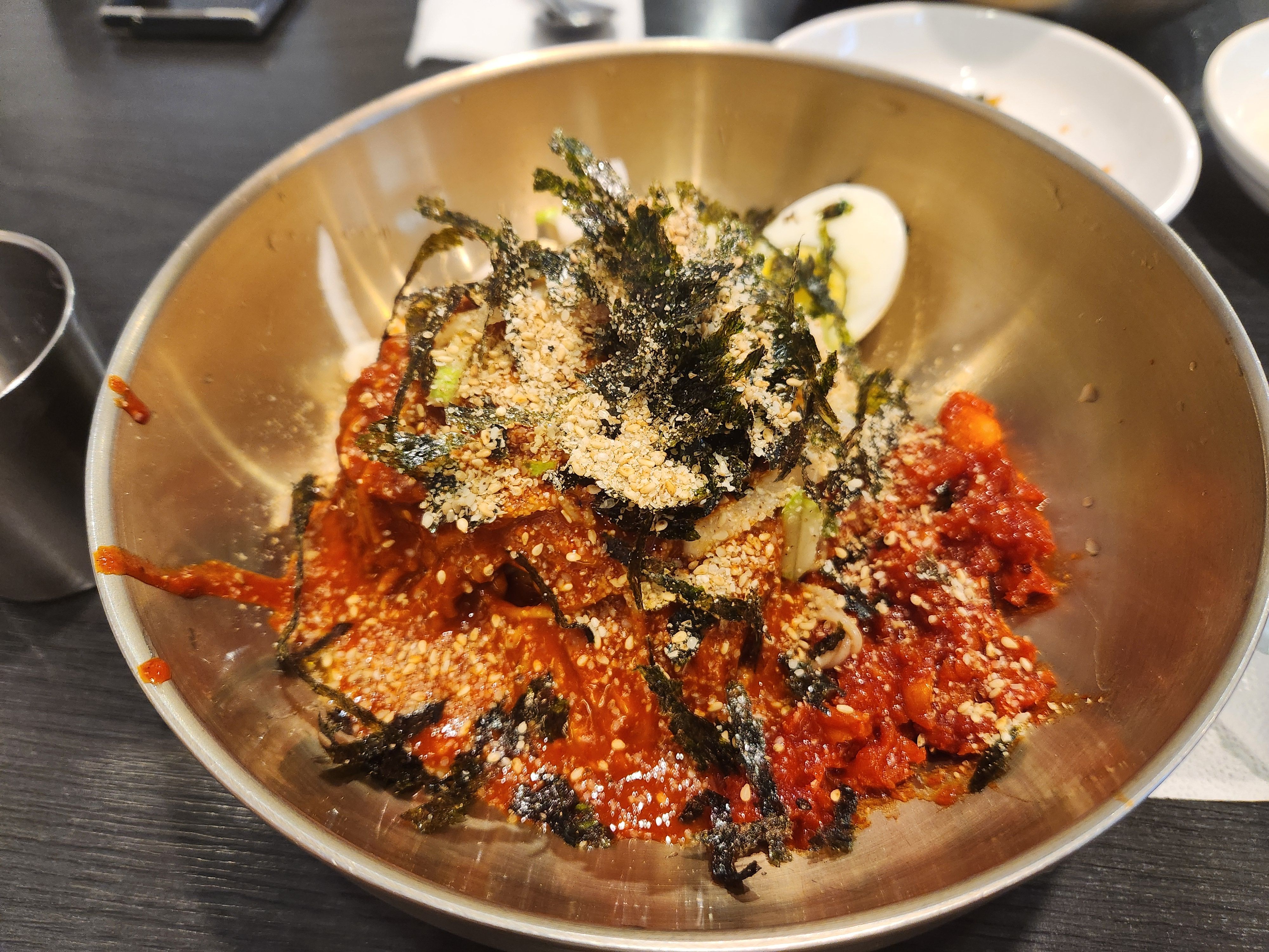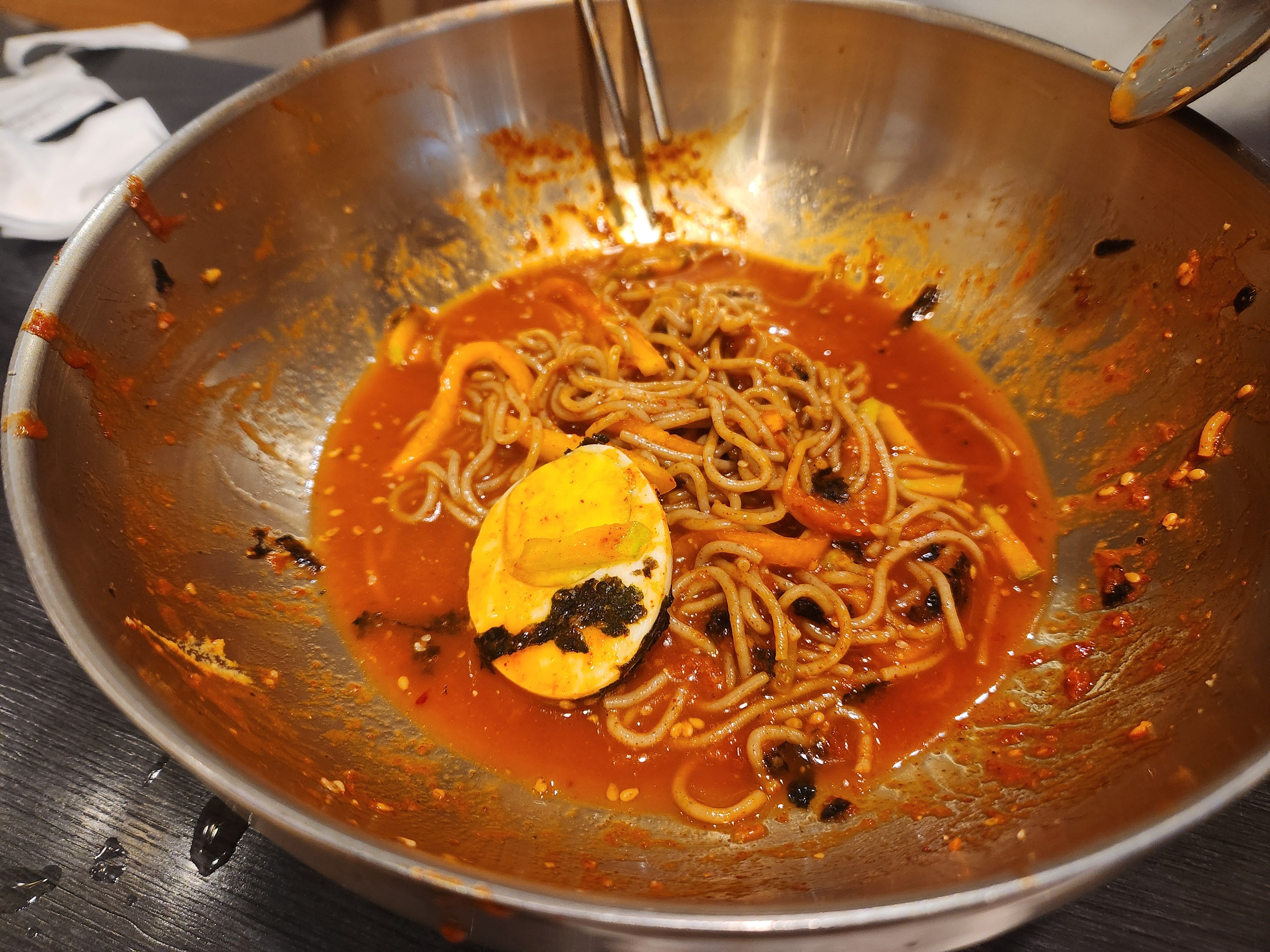 전체적으로 고소하고 깔끔한 맛인데 처음에 정말 맛있게 먹었는데 중간쯤은 살짝 느낌함이 느껴질 수 있어요~ 그때 양념 막국수를 한번 빼앗아 먹는 겁니다. ㅋㅋㅋ