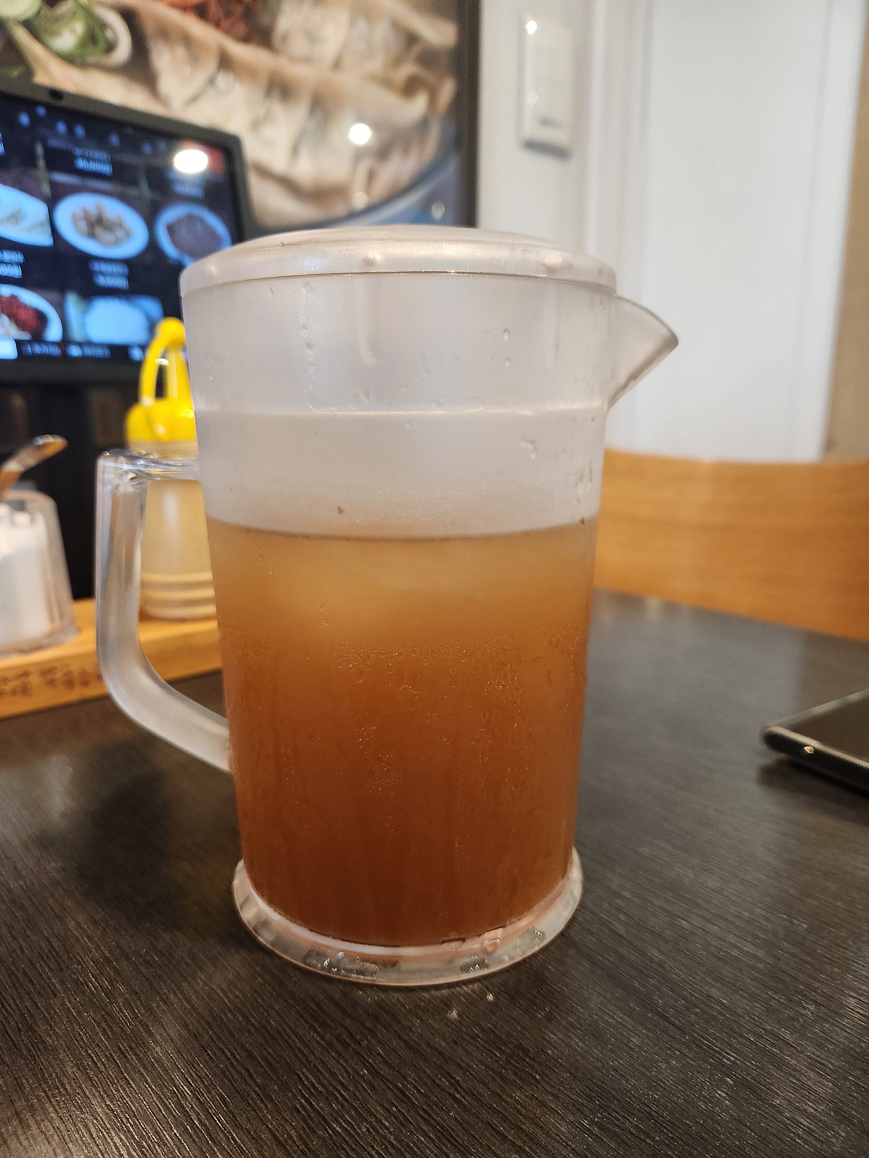 입구에 따뜻한 메밀차도 식후 음료로 준비되어 있습니다.인기가 좋아서 없는 날도 있던데 ㅇ늘은 차가 남아 있어서 한잔 마셨습니다. 숨이 턱턱 막히는 한여름이지만 따뜻한 메밀차를 마시니 속이 편하고 좋더라고요,,