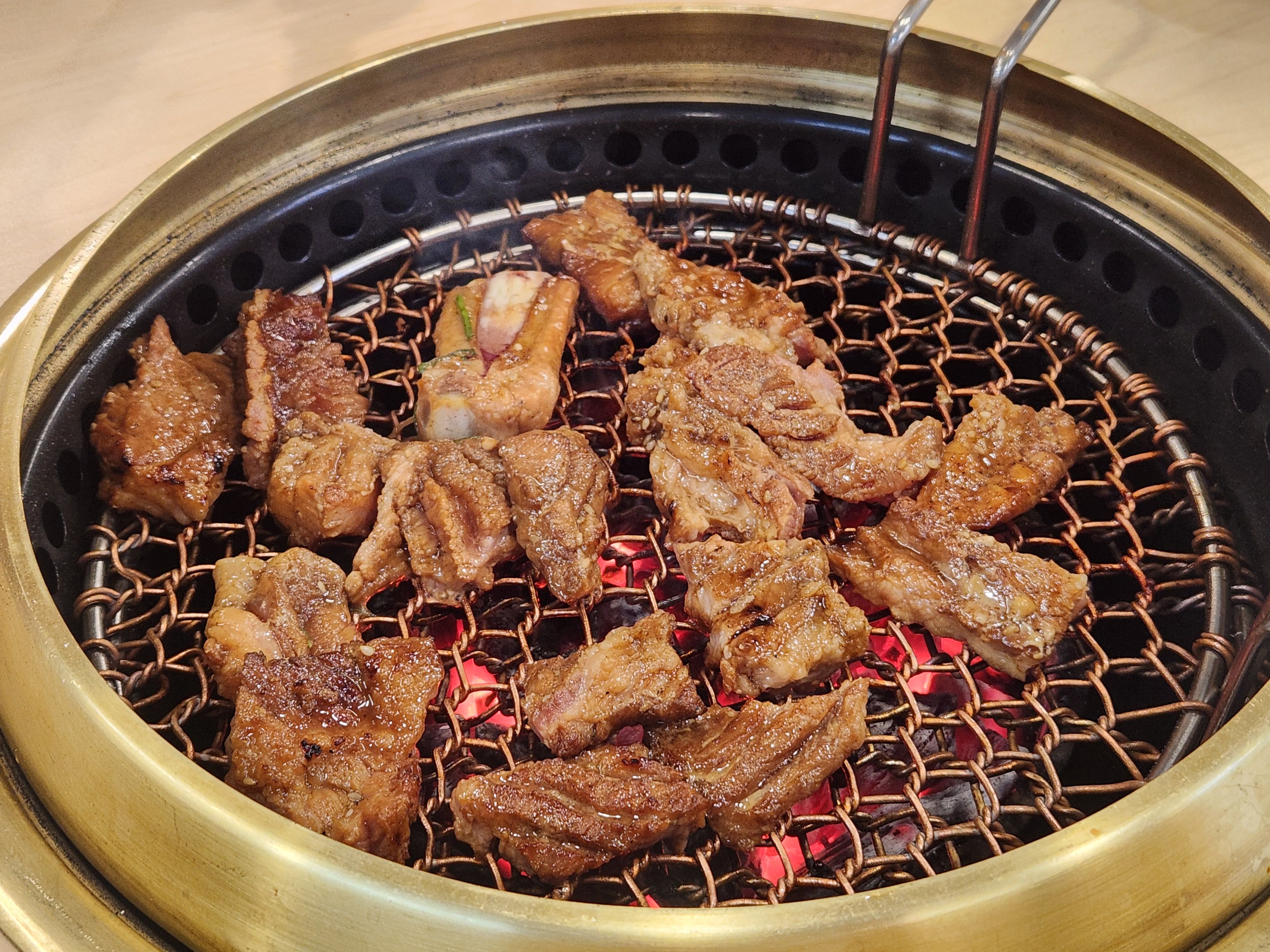과일 5가지와 약재 등으로 직접끓여 만든 특별 수제 양념으로 3일간 숙성시킨 돼지갈비는 달콤함과 감칠맛으로 심가면옥의 시그니쳐 메뉴로 20년이상 한곳에서 버틴 이유가 있습니다. 타지 않게 휘릭휘릭 뒤집어 주면서 맛있게 구워줍니다~