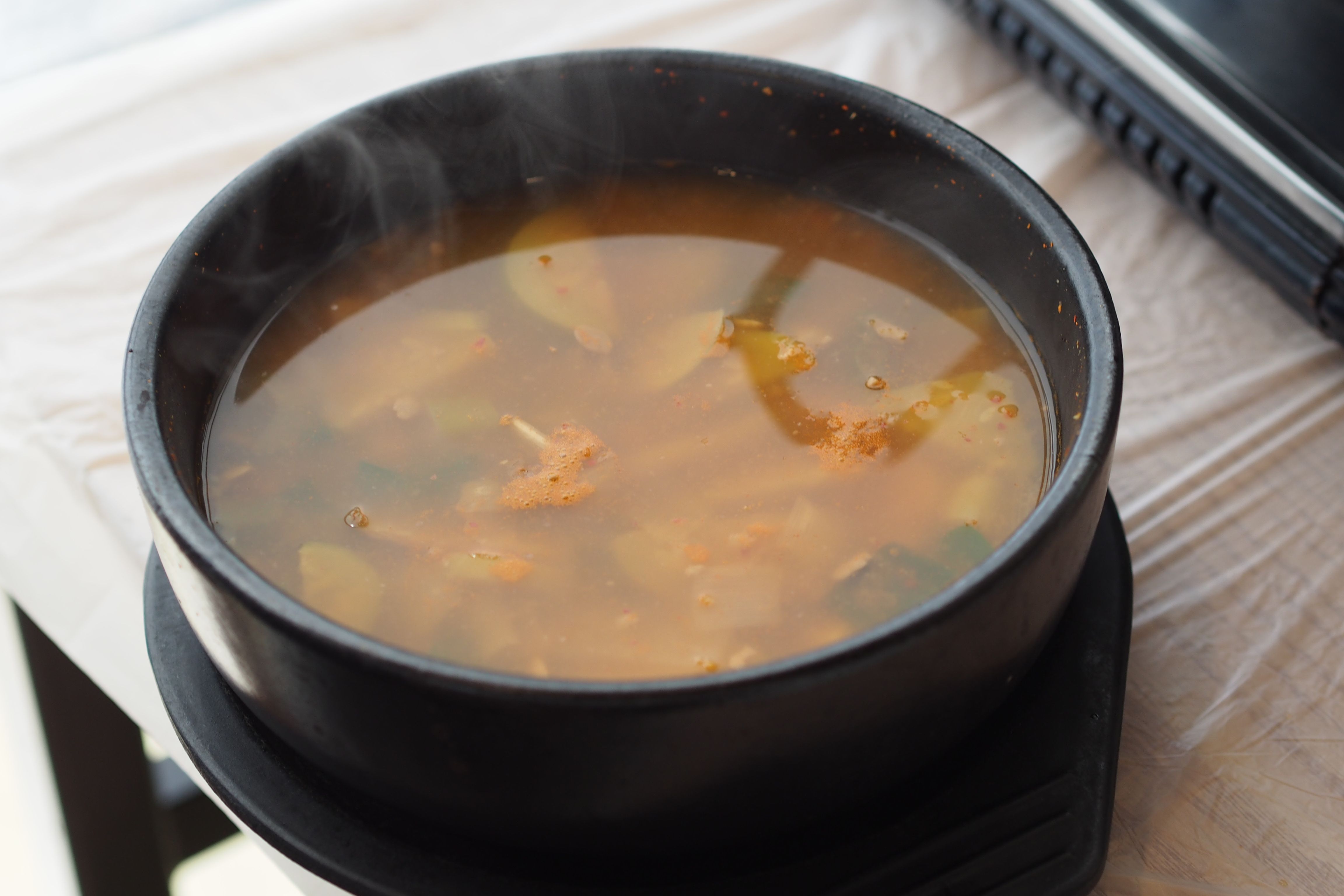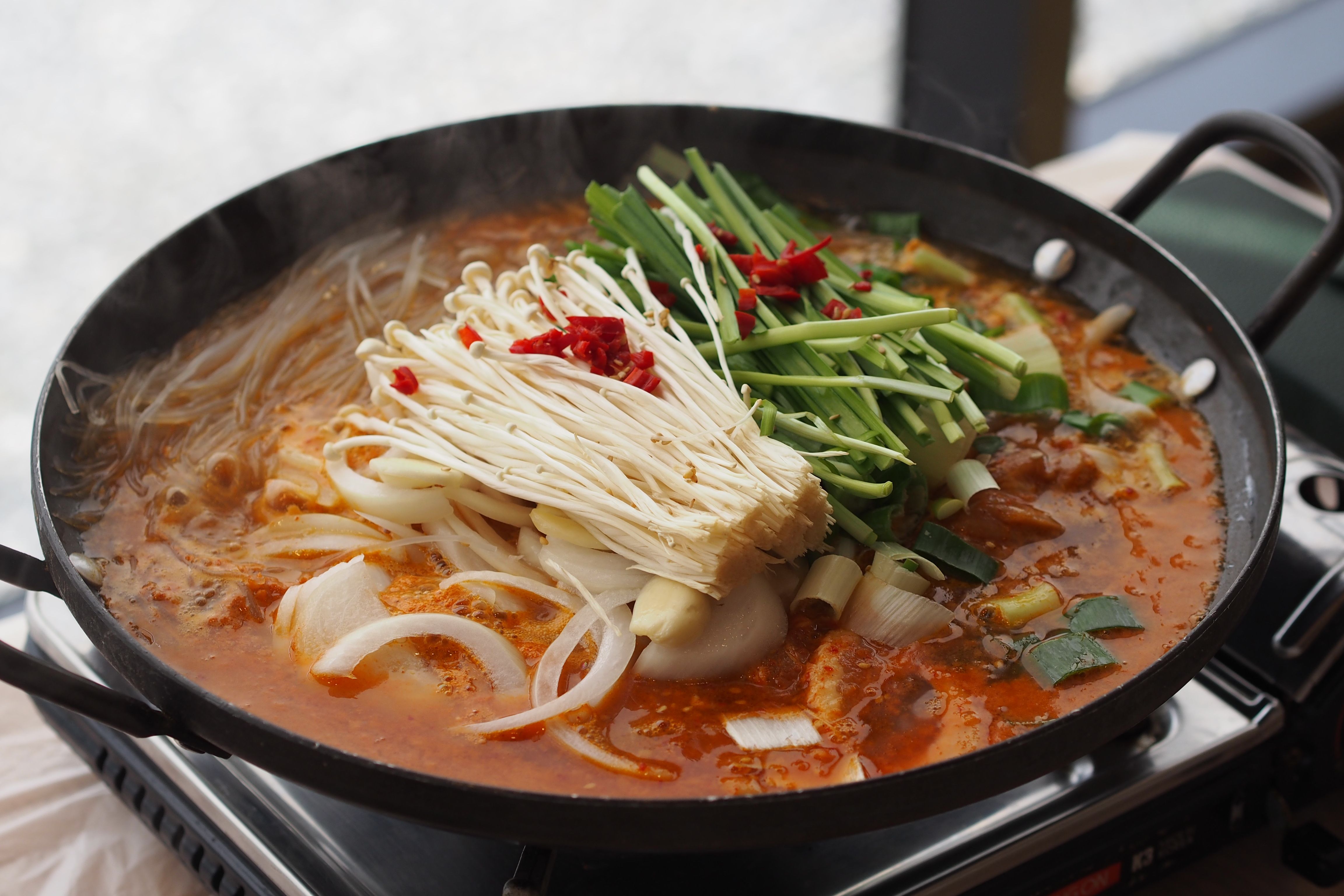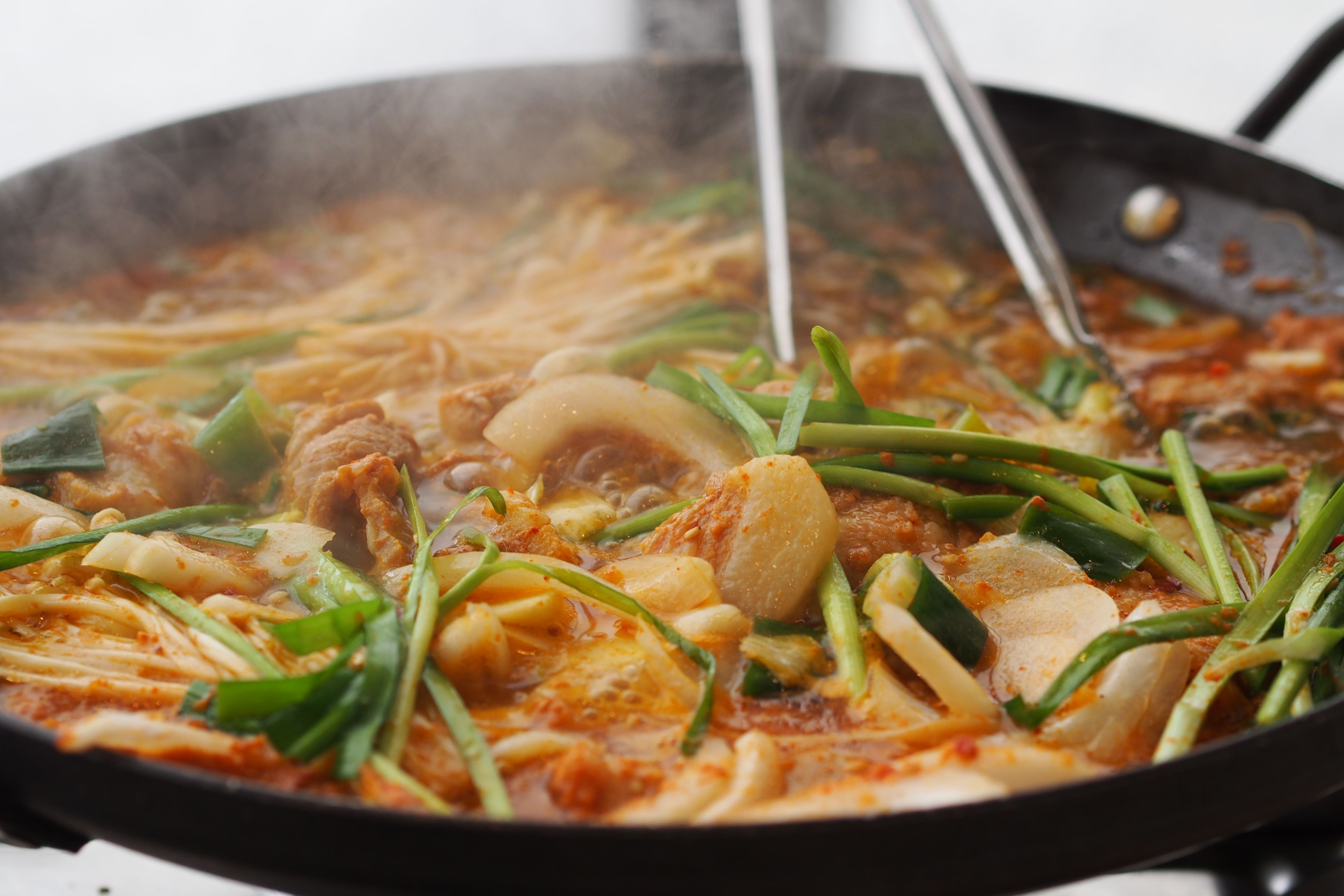 테이블 위에서 조리되어 마지막까지 따뜻하게 먹을 수 있는 장점이 있네요~ 돼지고기와 채소들이 매콤한 양념에 버무려져 있는데 지글지글 끓으면서 익어가는 모습을 보니 식욕을 더 돋우는 것 같습니다.