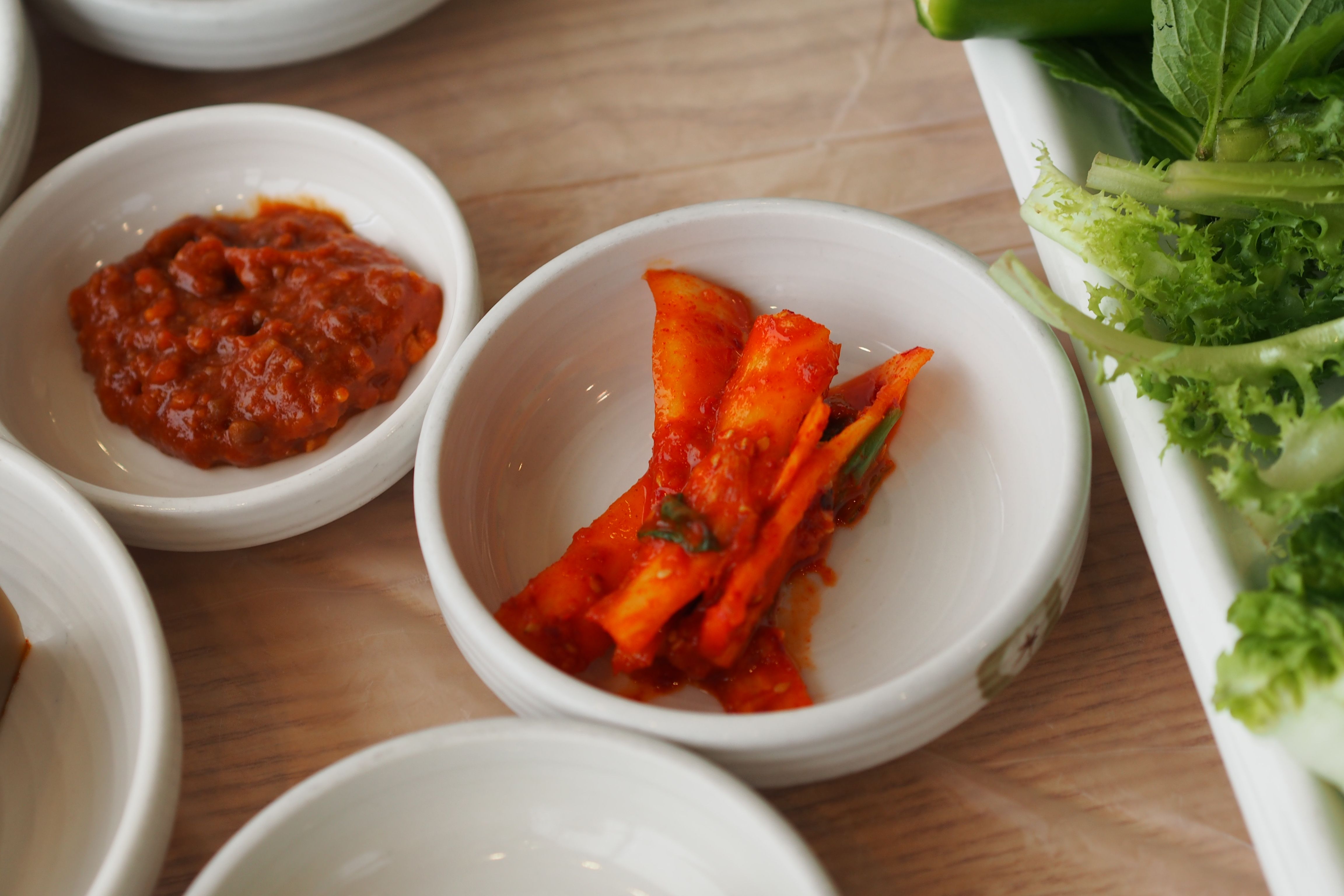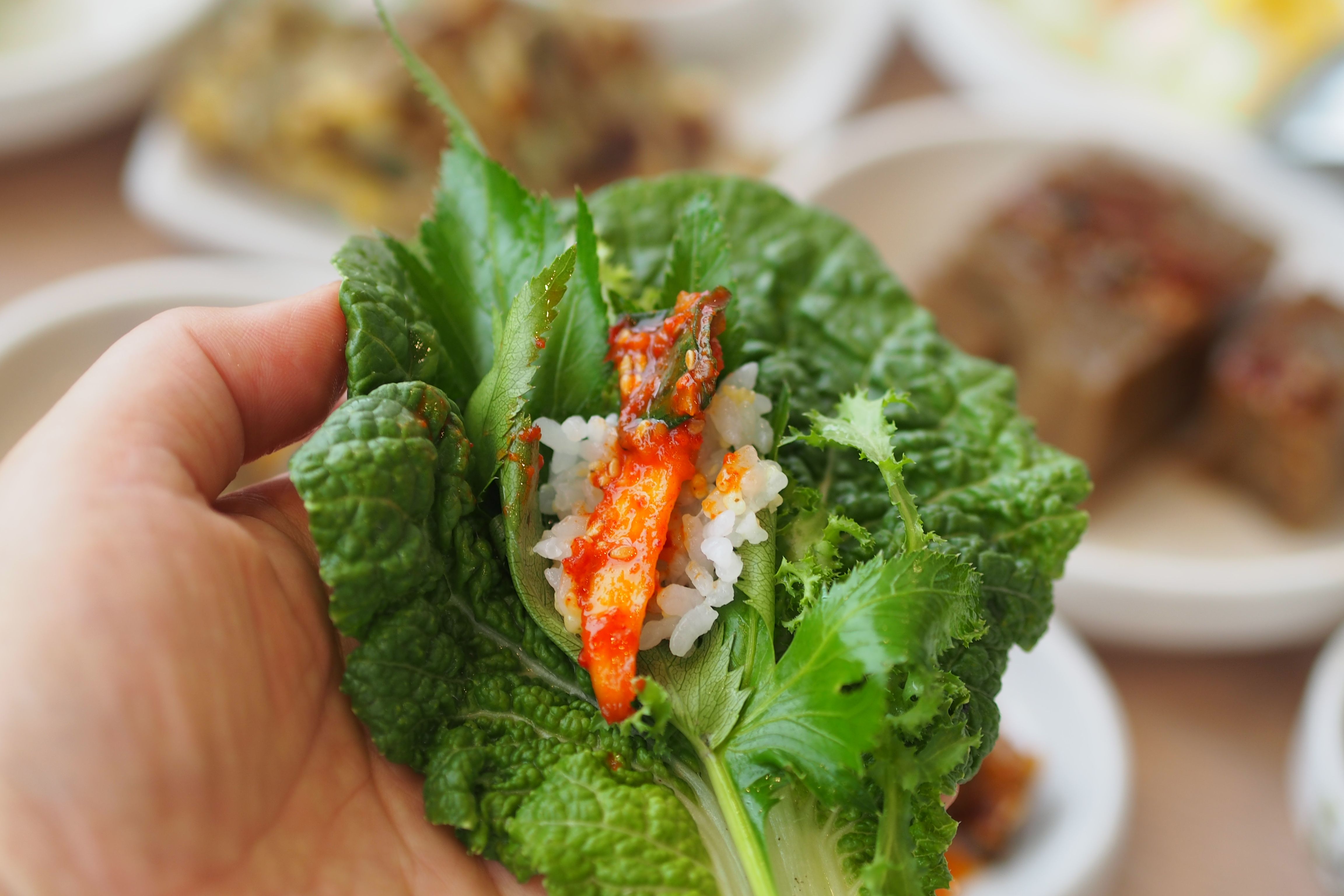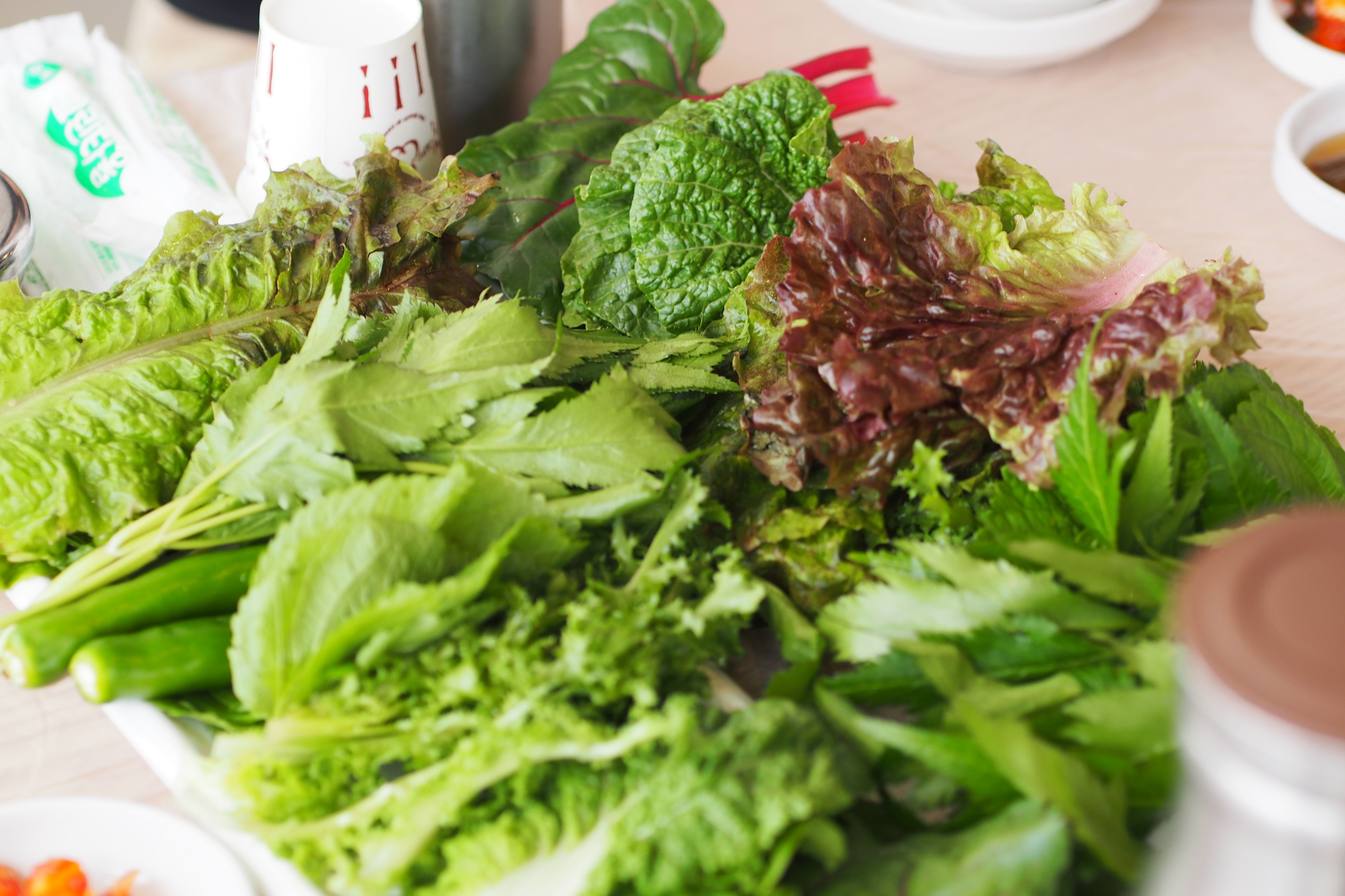 쌈채소고 다양하게 나와줍니다. 쌈채소를 부드러운 것과 향긋한 것들을 여러 장 겹쳐 다양하게 즐길 수 있었습니다.