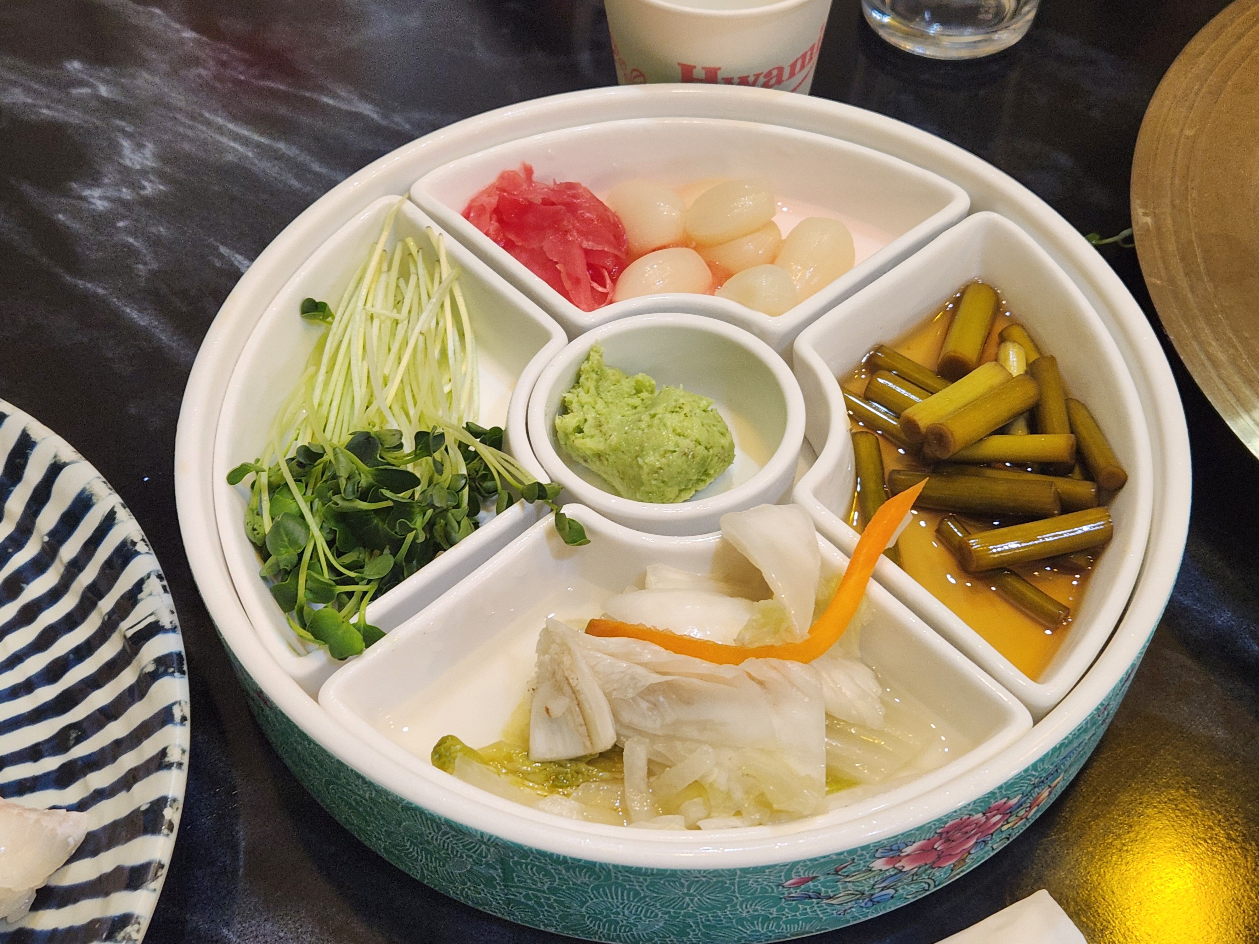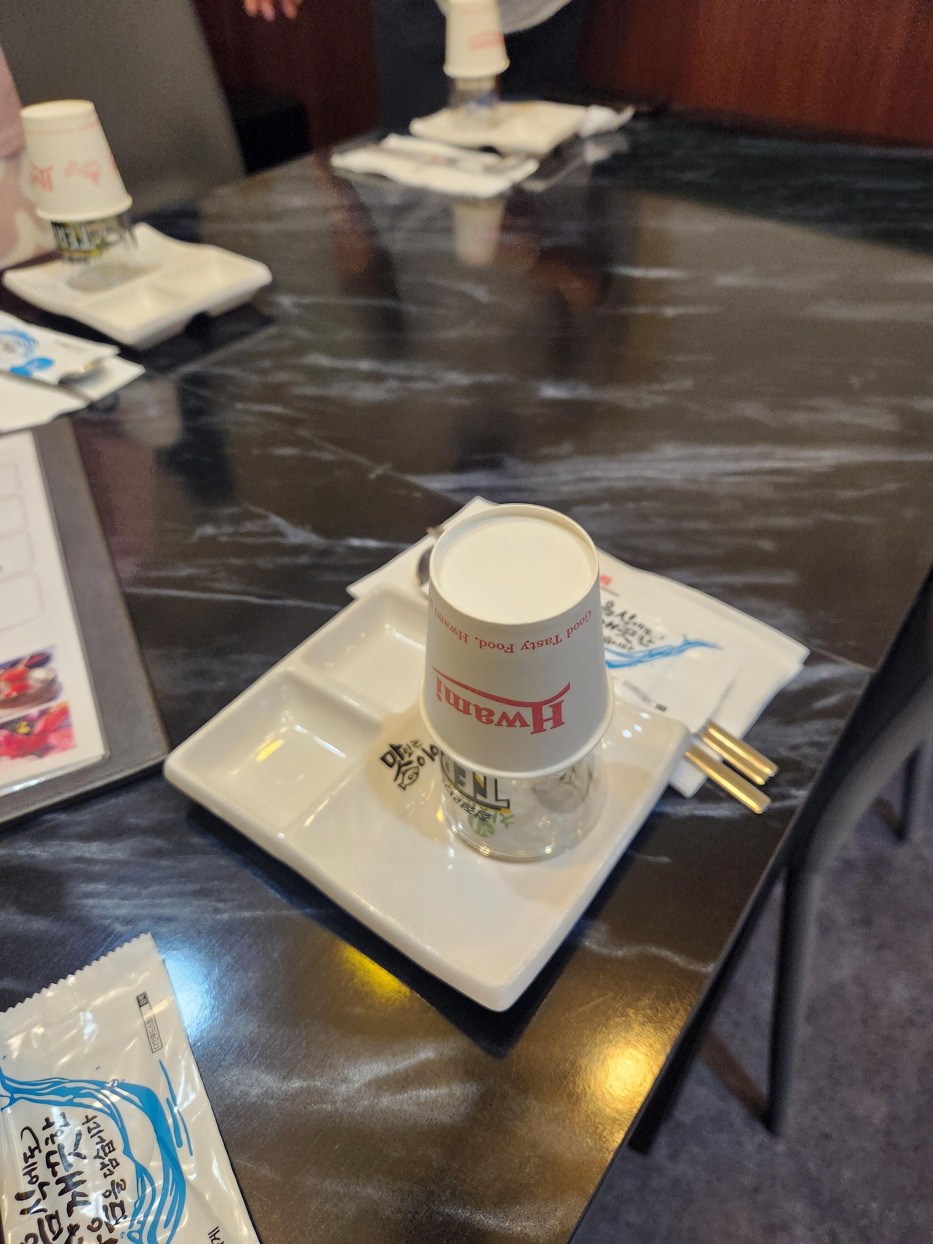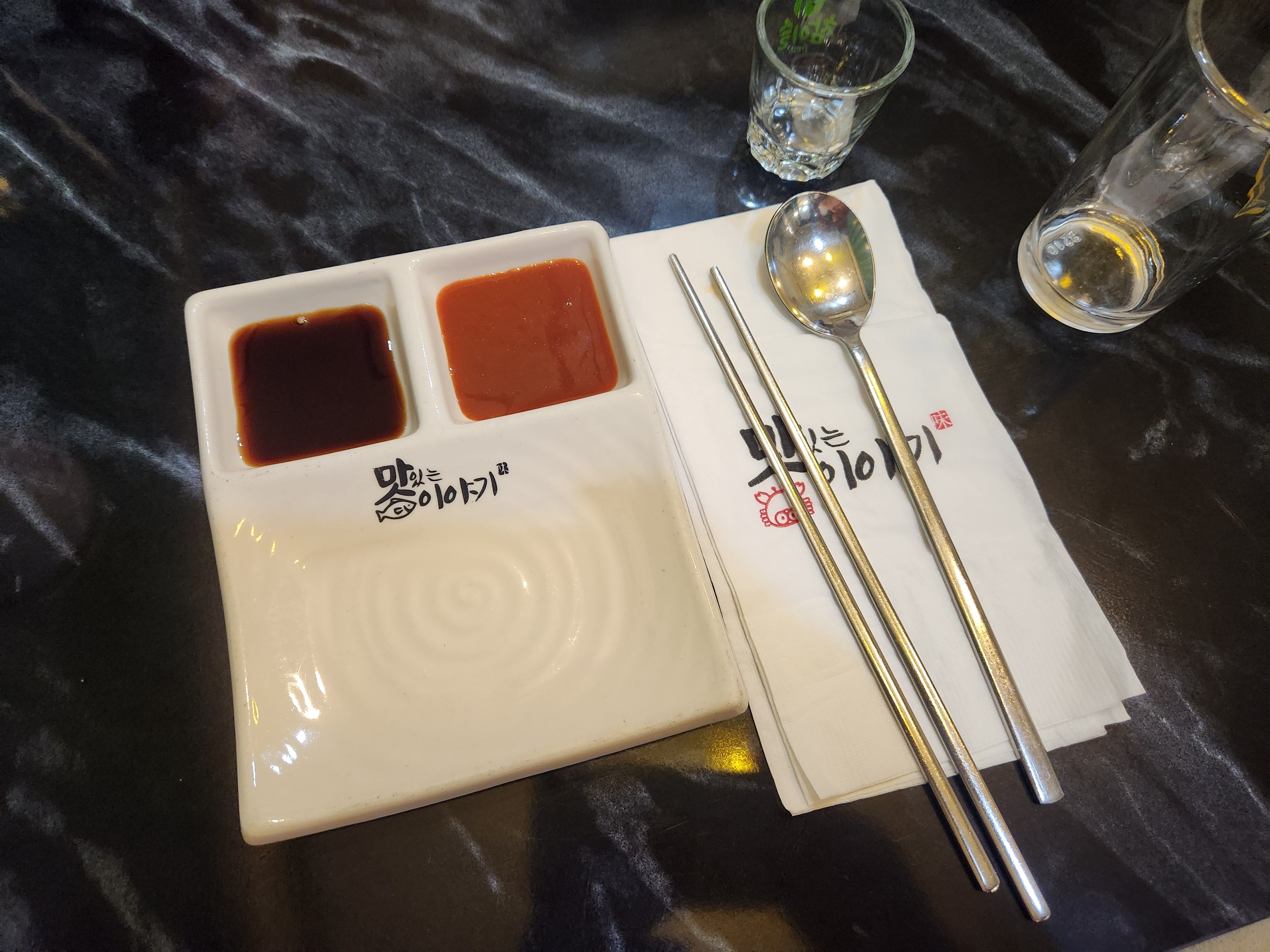 정갈한 식기가 미리 세팅되어 있고 간장과 초고추장을 한 그릇에 담고 앞접시까지 되어 있는 식기라 아주 사용하기 좋았습니다. 이제 음식이 나오기를 기다려봅니다.