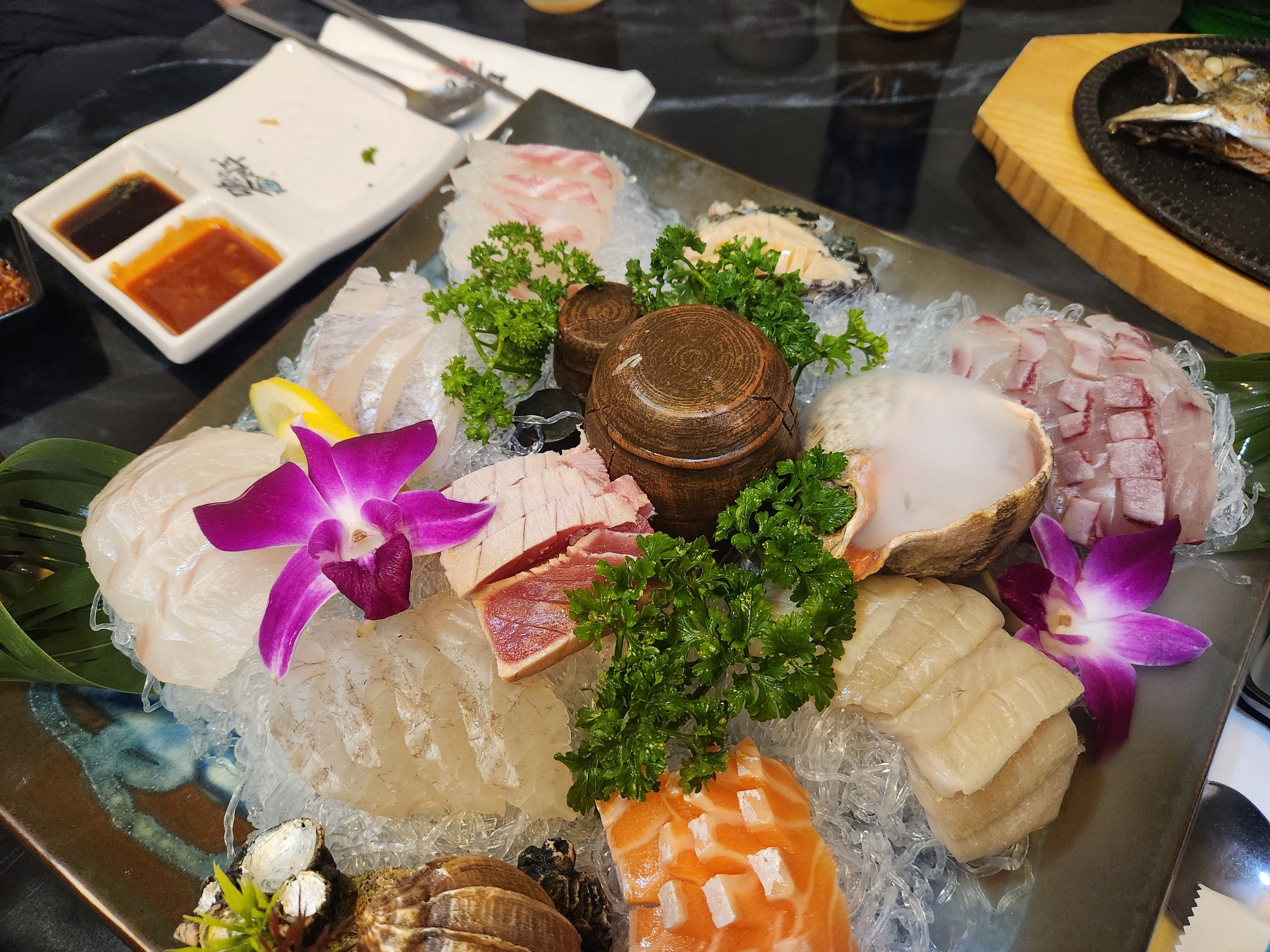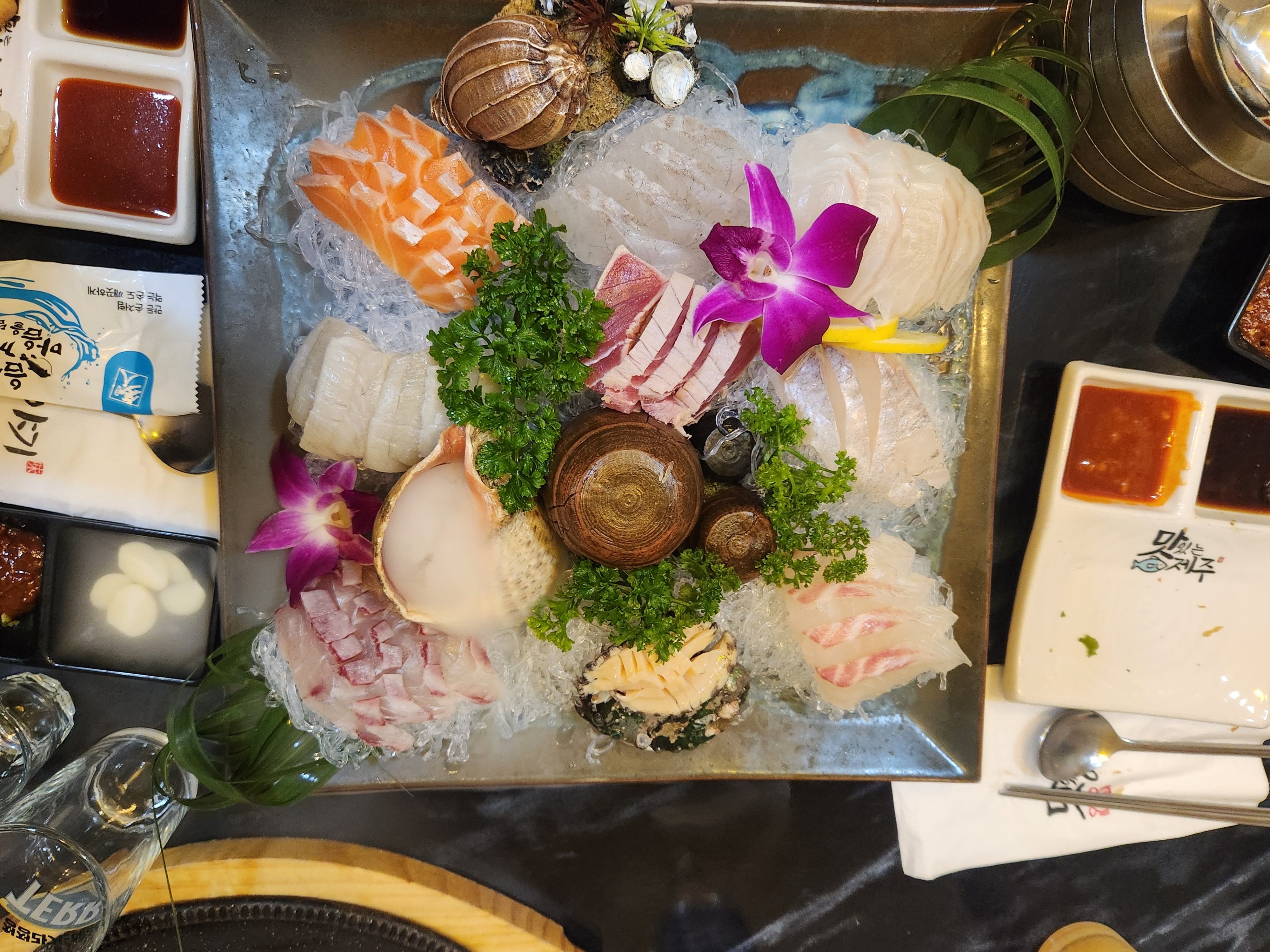 그리고 바로 모둠회가 나왔습니다. 연어, 참치, 도미, 전복등 다양하게 나옵니다. 일단 제 취향대로 두툼하게 나와서 더 맛있게 먹은듯합니다. 퀄리티도 좋아서 더 맛있게 먹었답니다.