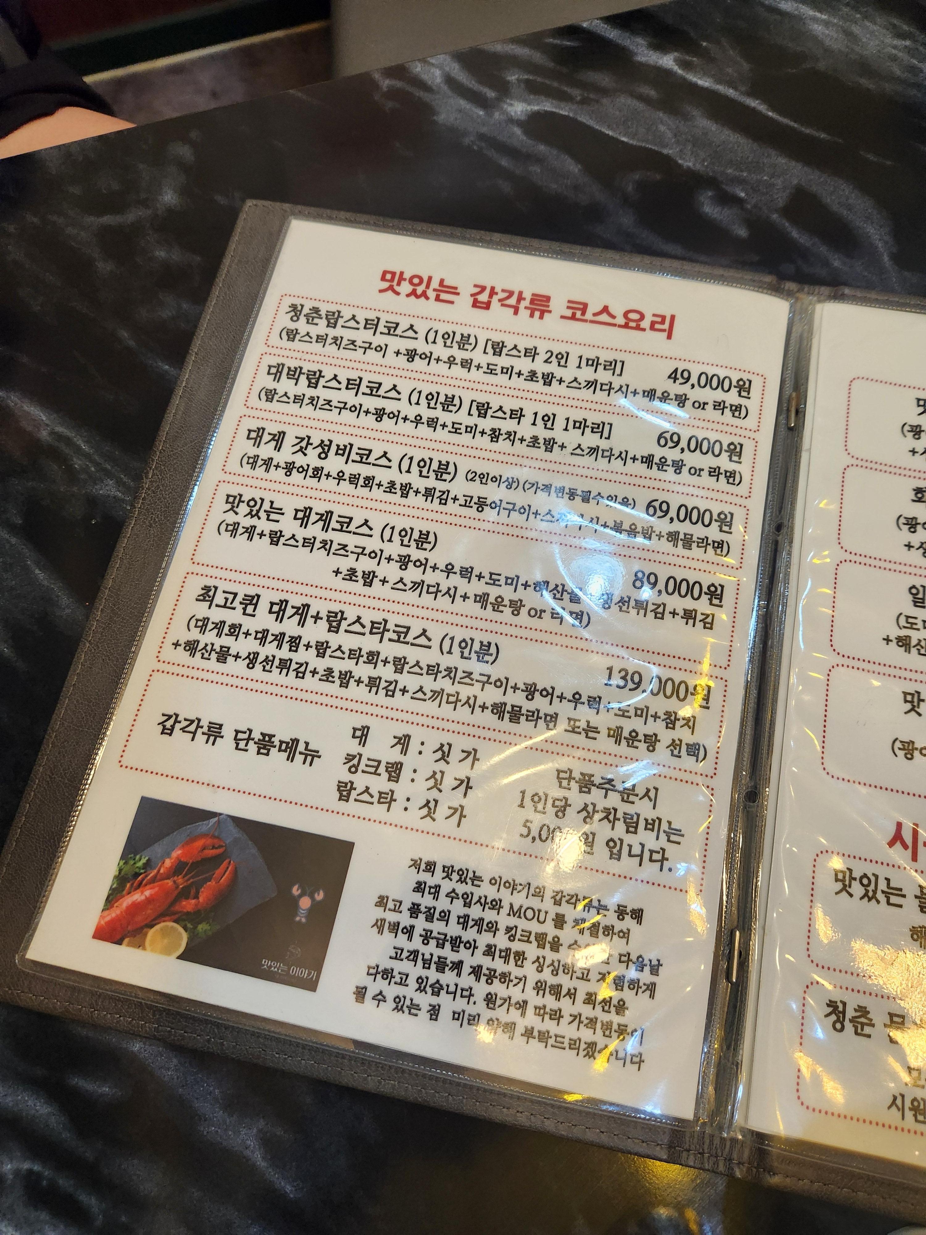 추석연휴를 코앞에 두고 일찍 퇴근하는 회사도 많은데 저희는 회식을 했습니다. 그래서 가성비 좋은 청춘랍스터코스 (1인분 :49,000원)으로 정했습니다. 청춘랍스터코스는 랍스터 반마리가 나오는데 1인 1마리를 원하시면 대박 랍스터 코스를 드시면 될 것 같아요~ 킹크랩이나 회코스도 있으니 취향대로 선택하시면 좋을 것 같습니다.