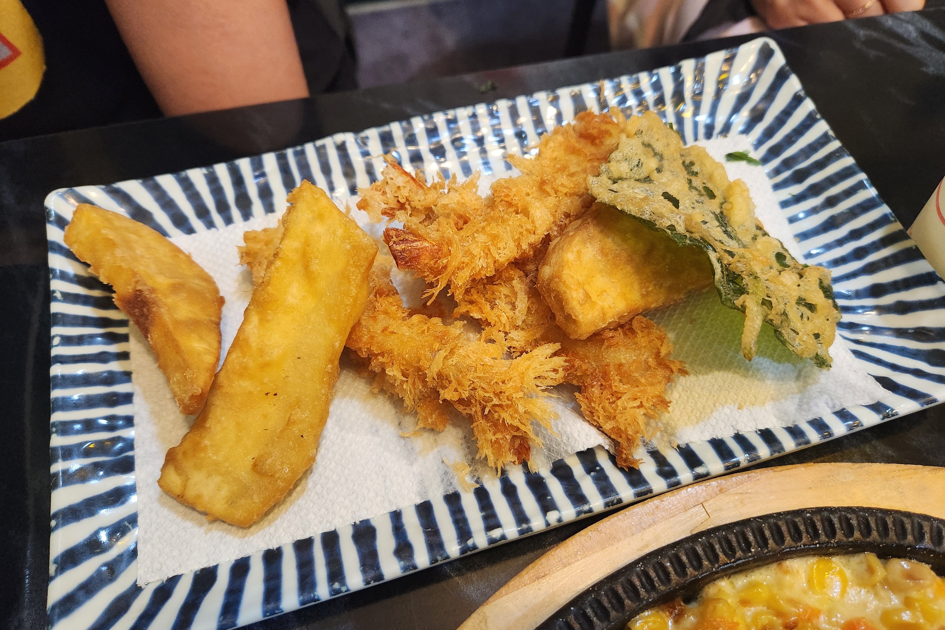 그리고 튀김은 고구마, 새우, 깻잎입니다, 바삭하니 역시 맛이 좋습니다.