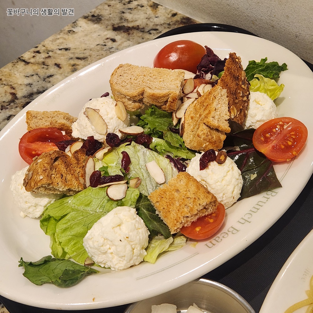 샘플러는 브런치빈의 시그니처 메뉴답게 구성이 알찼습니다. 구운 버섯, 소시지, 베이컨, 스크램블 에그, 프렌치토스트 등이 한 접시에 가득 담겨 나와 골라 먹는 재미가 쏠쏠했습니다. 다양한 식재료를 한 번에 맛보고 싶은 분들께 강력 추천합니다.