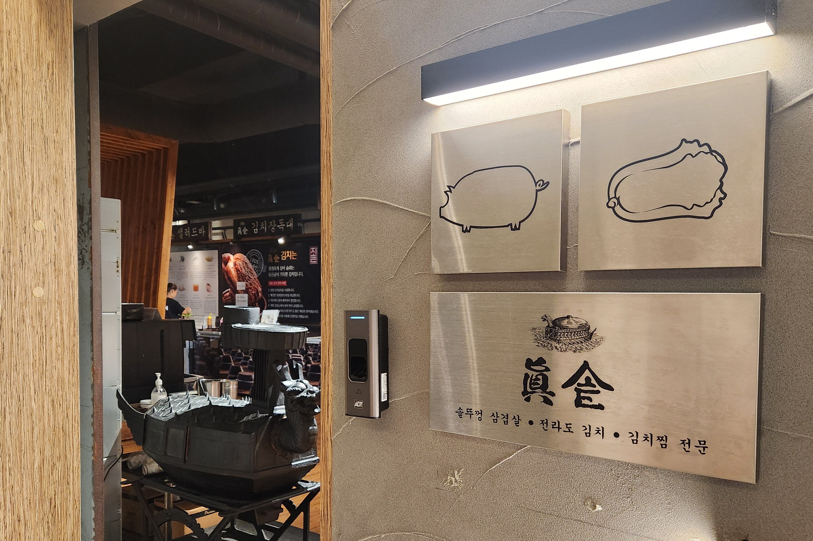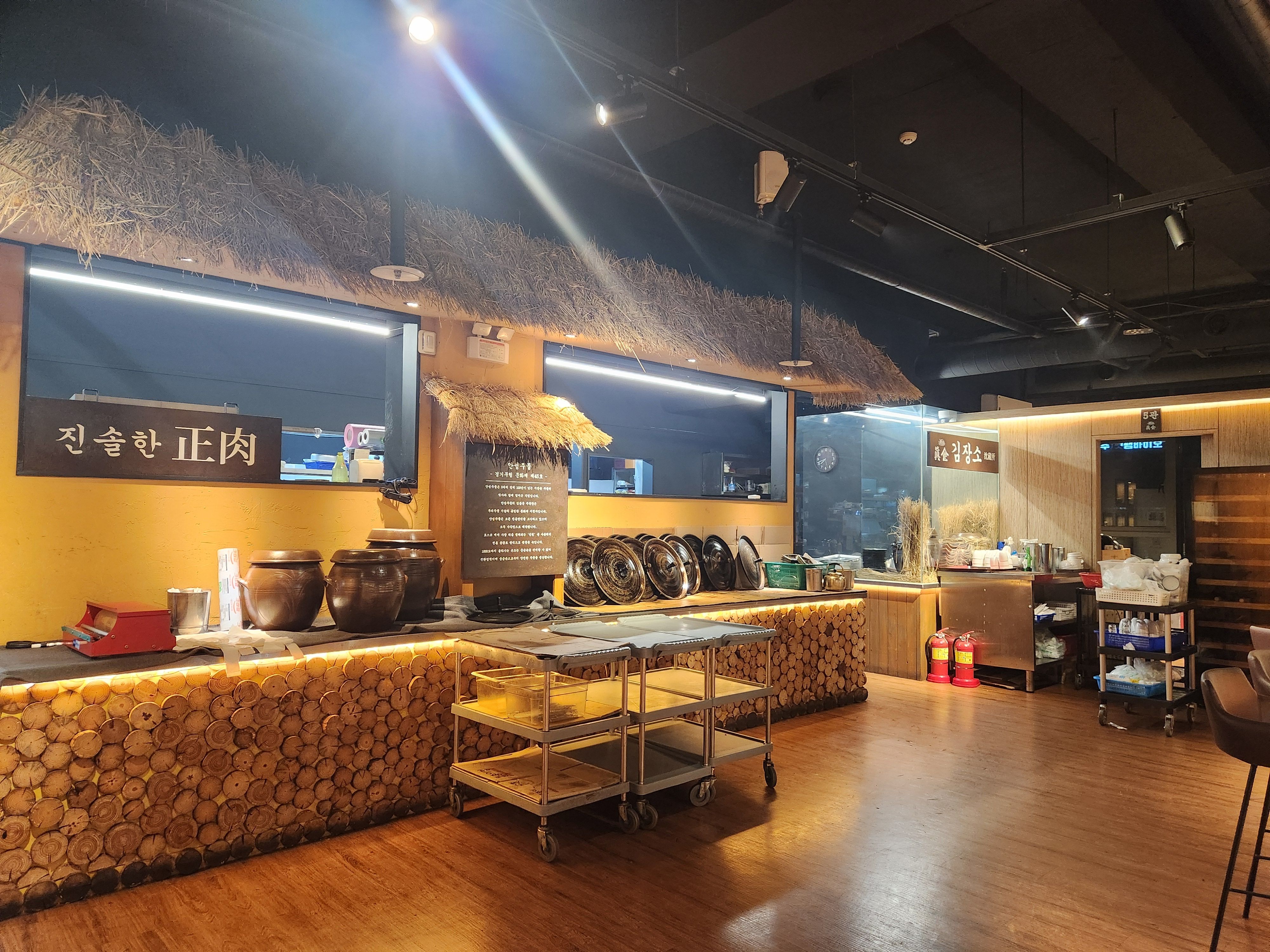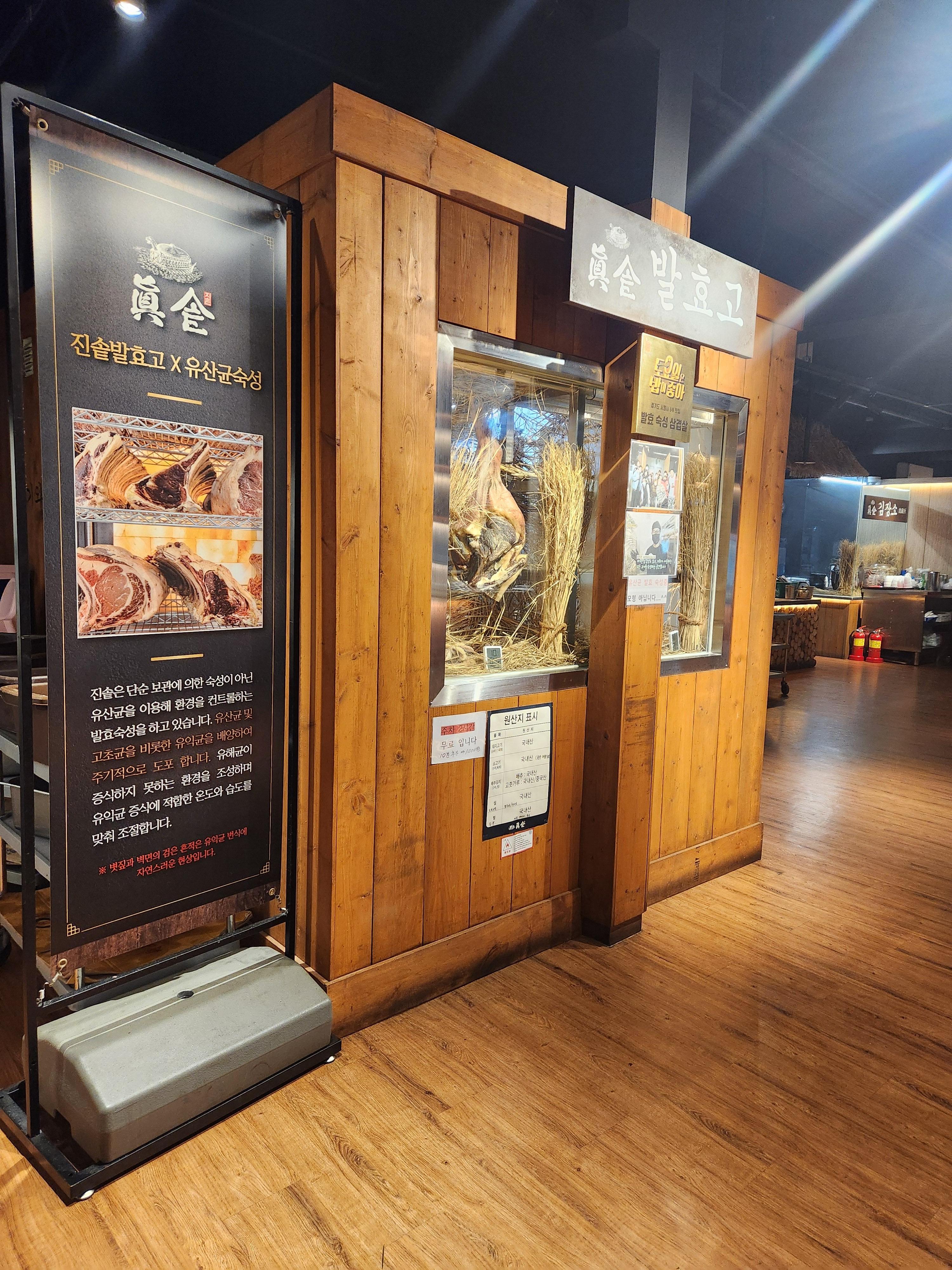 입구에 들어 서자마자 보이는 숙성고, 모형이 아니라 실제로 발효숙성 삼겹살을 발효시키는 모습입니다. 진솥은 단순한 보관에 의한 숙성이 아닌 10~14일간 유익균으로 발효 숙성을 하고 있다고 합니다. 유익균으로 발효를 하면 고기의 지방층 사이의 단백질을 분해새 감칠맛과 쫄깃함을 더해준다고 하네요.