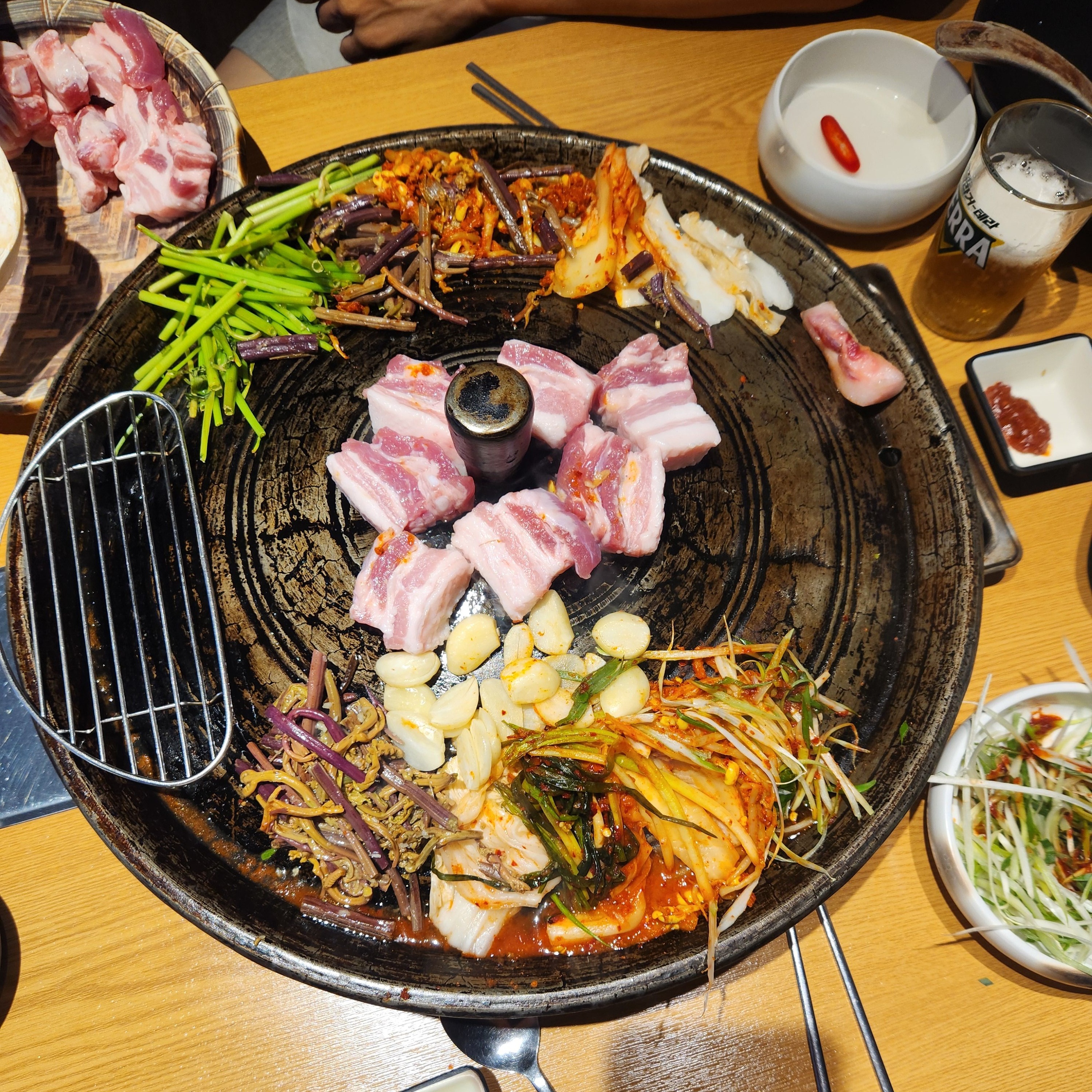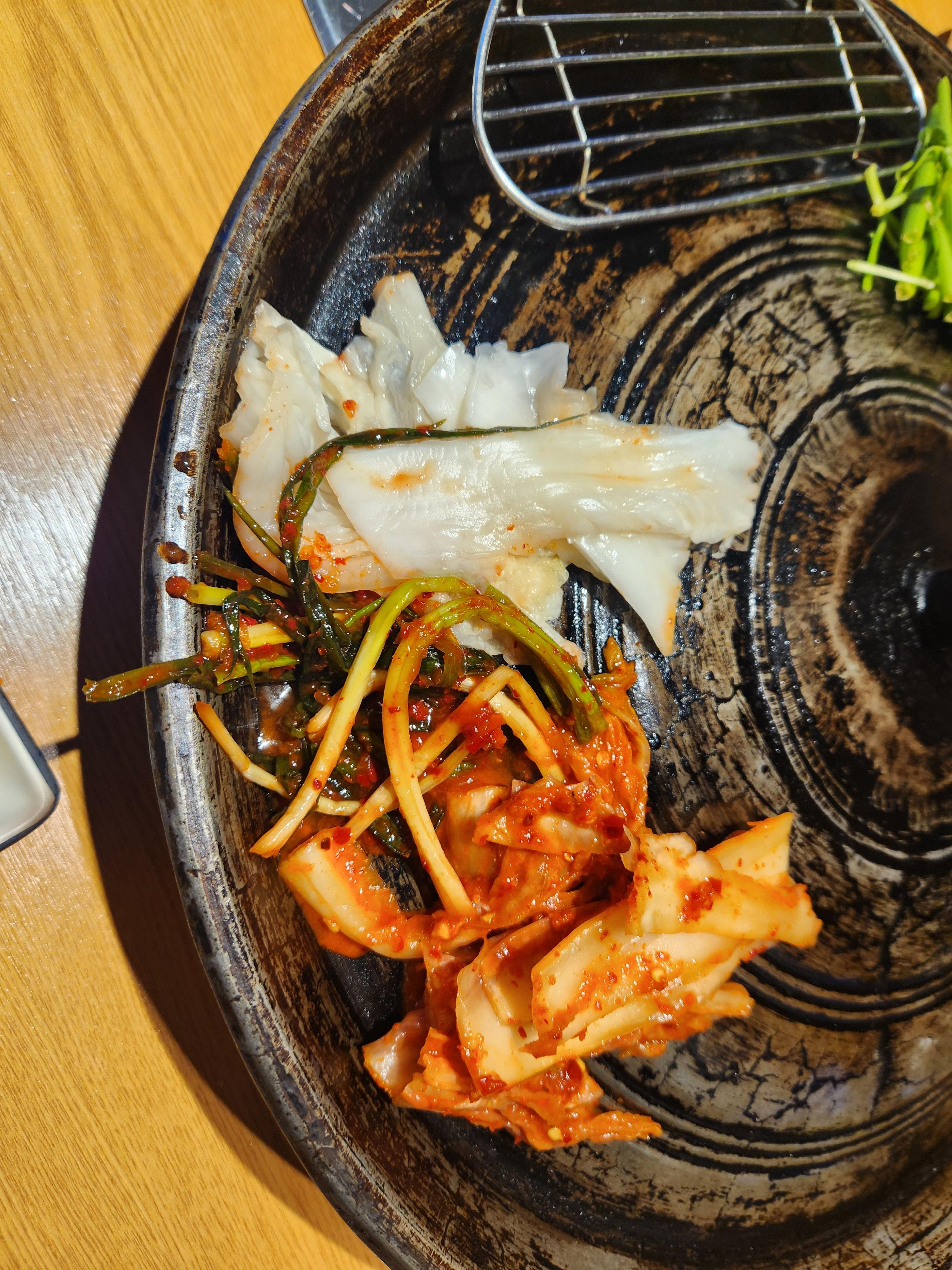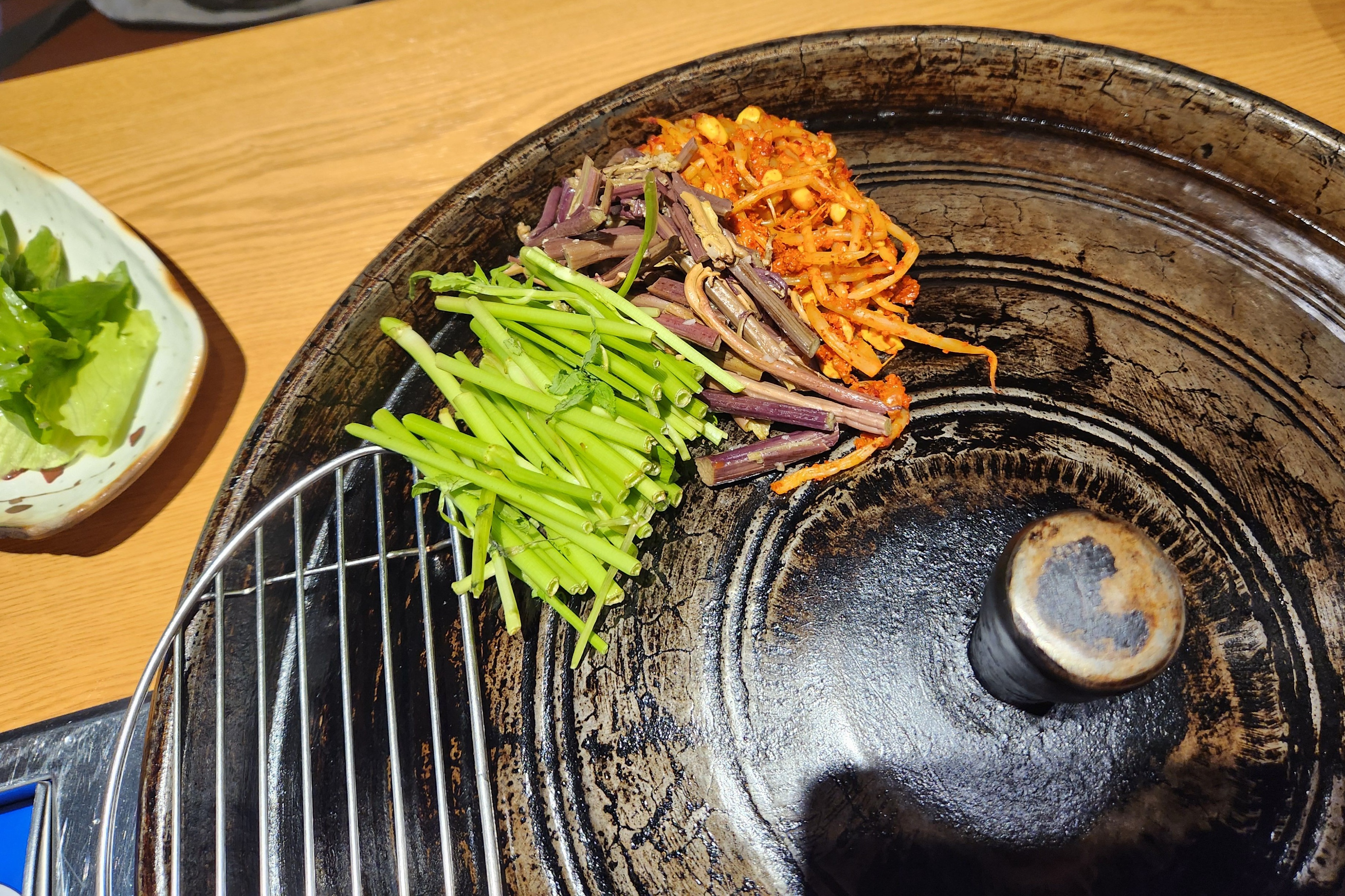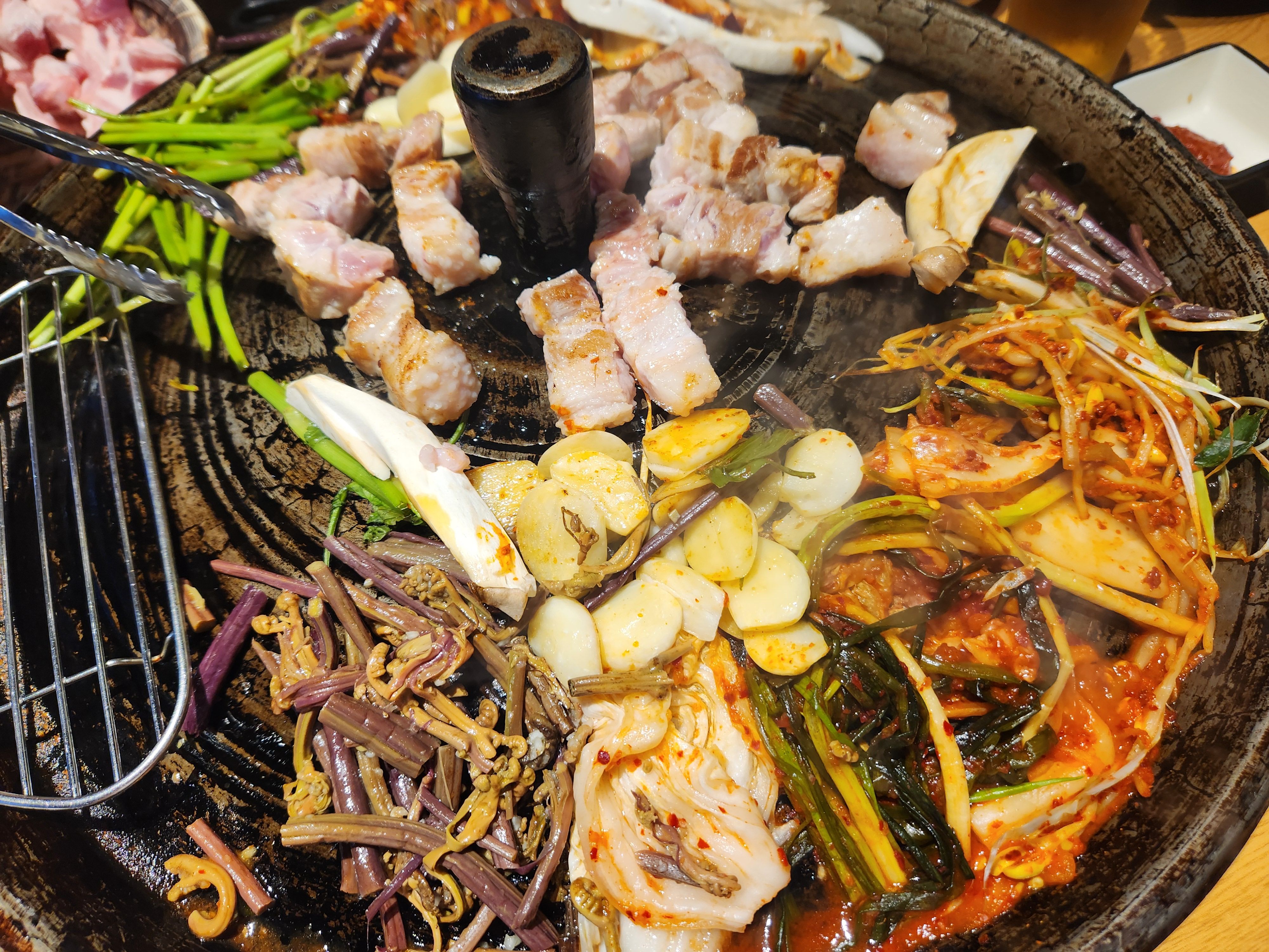 미나리와 고사리도 있어 함께 구워 먹기로 했습니다, 요즘 이렇게 나오는 식당들이 많이 생기는 것 같네요^^ 고기가 나오기도 전에 미리 올렸습니다. 배추김치, 백김치, 파김치,, 종류도 세 가지나 나오는데 그냥 먹는 것보다 익혀서 삼겹살과 함께 먹기 위해 솥 위에 올려두었습니다.