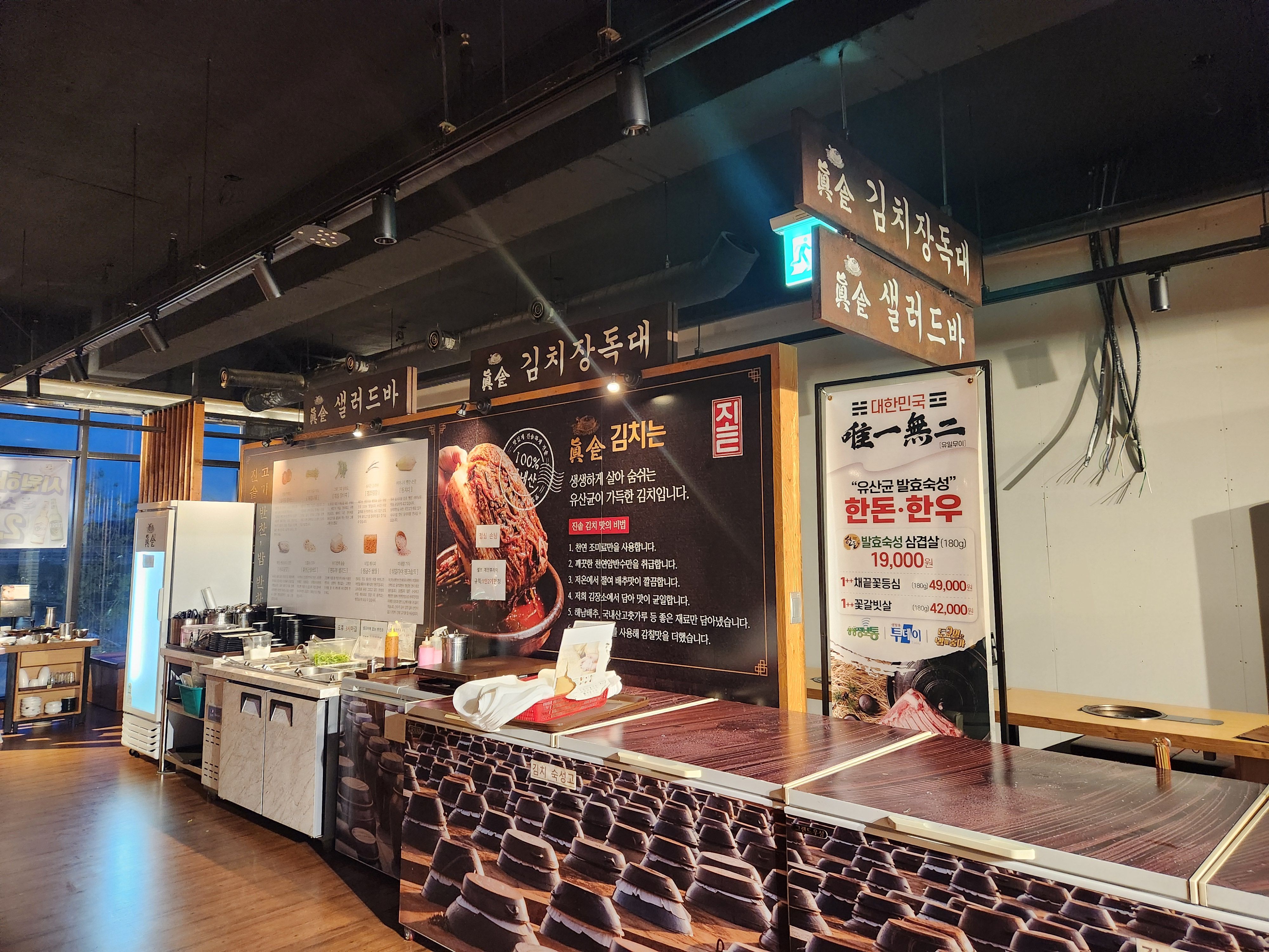 김치장독대와 샐러드바가 있어 밑반찬등을 가져다 먹을 수 있습니다.