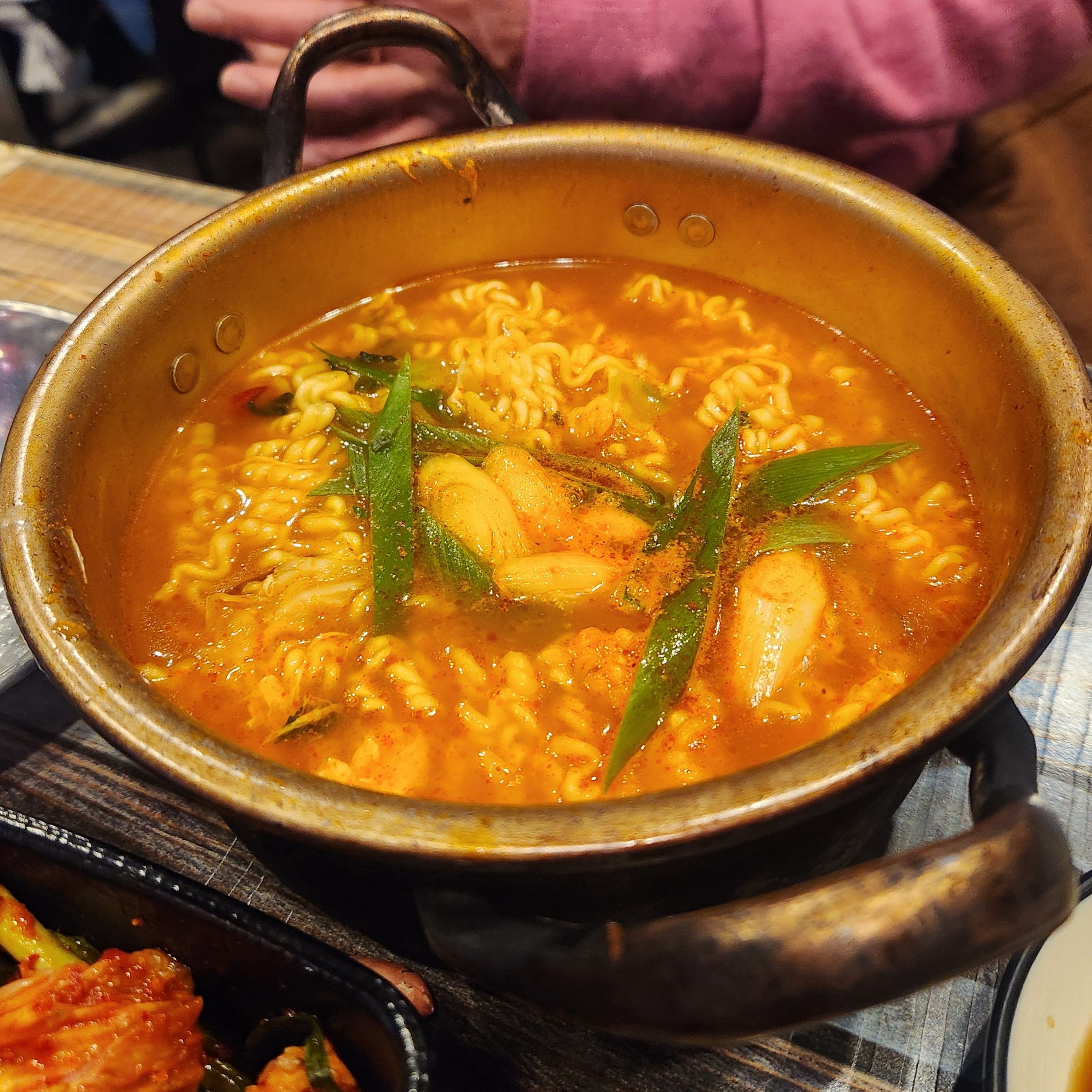 마지막으로 우리의 밤을 완벽하게 마무리해 준 메뉴는 바로 얼큰냄비라면이었습니다. 보글보글 끓어오르는 냄비 속 라면은 보는 것만으로도 얼큰함이 느껴져서 추운 날씨에 몸을 녹이기에 정말 좋았습니다. 면발은 꼬들꼬들하게 잘 익었고, 국물은 이름 그대로 '얼큰함'의 정석이었어요. 해장용으로도 완벽한 신중동역 라면 맛집이었어요.