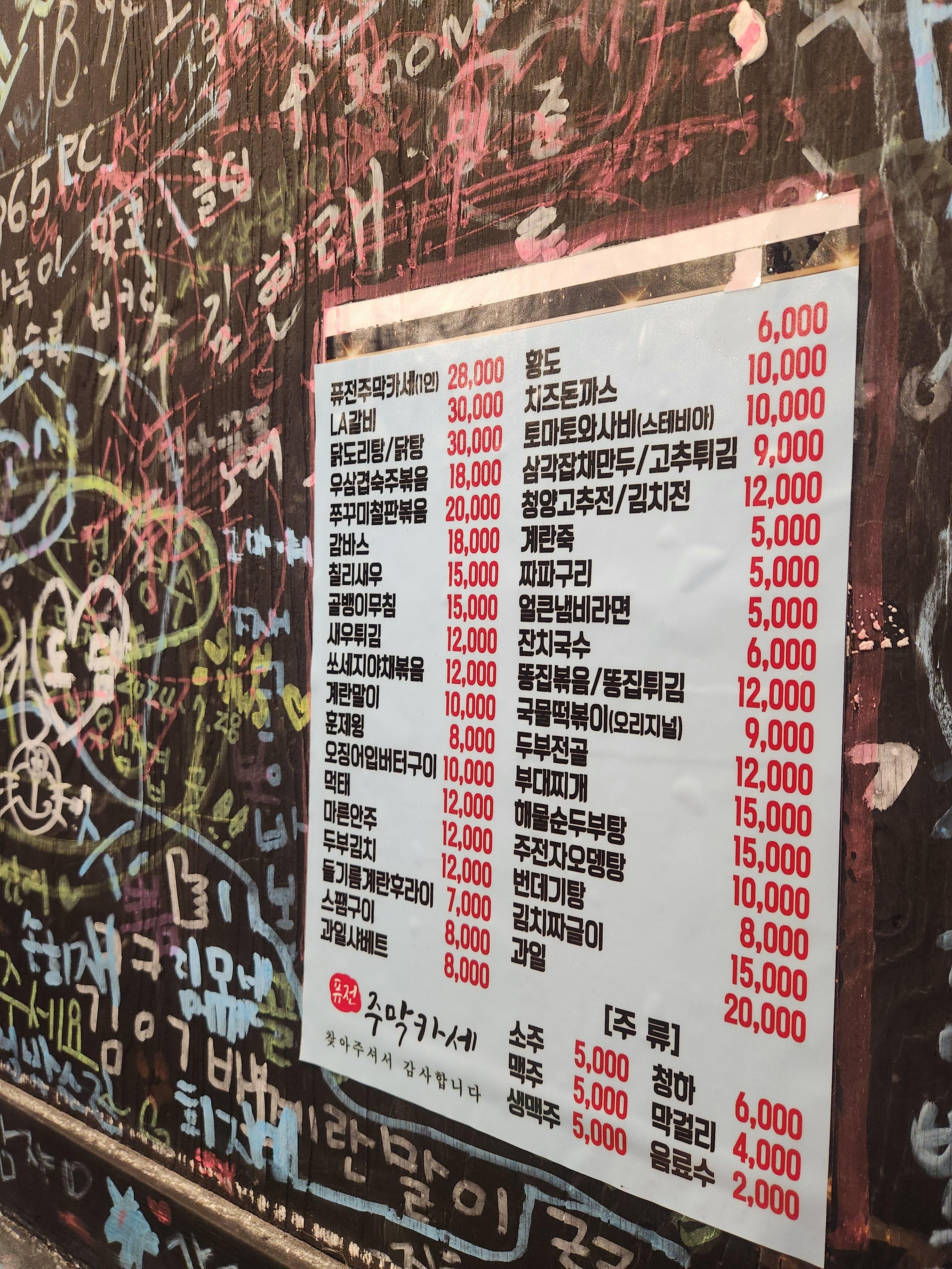 자리에 앉자마자 기분 좋은 설렘과 함께 메뉴판을 확인했습니다. '퓨전주막카세'라는 이름에 걸맞게 전통적인 한식 안주부터 퓨전 요리까지 다채로운 메뉴들이 가득했습니다. 저와 친구들이 신중하게 고른 오늘의 메뉴는 바로 닭똥집볶음, 청양고추전, 그리고 얼큰냄비라면! 여기에 시원한 생맥주가 빠질 수 없겠죠?