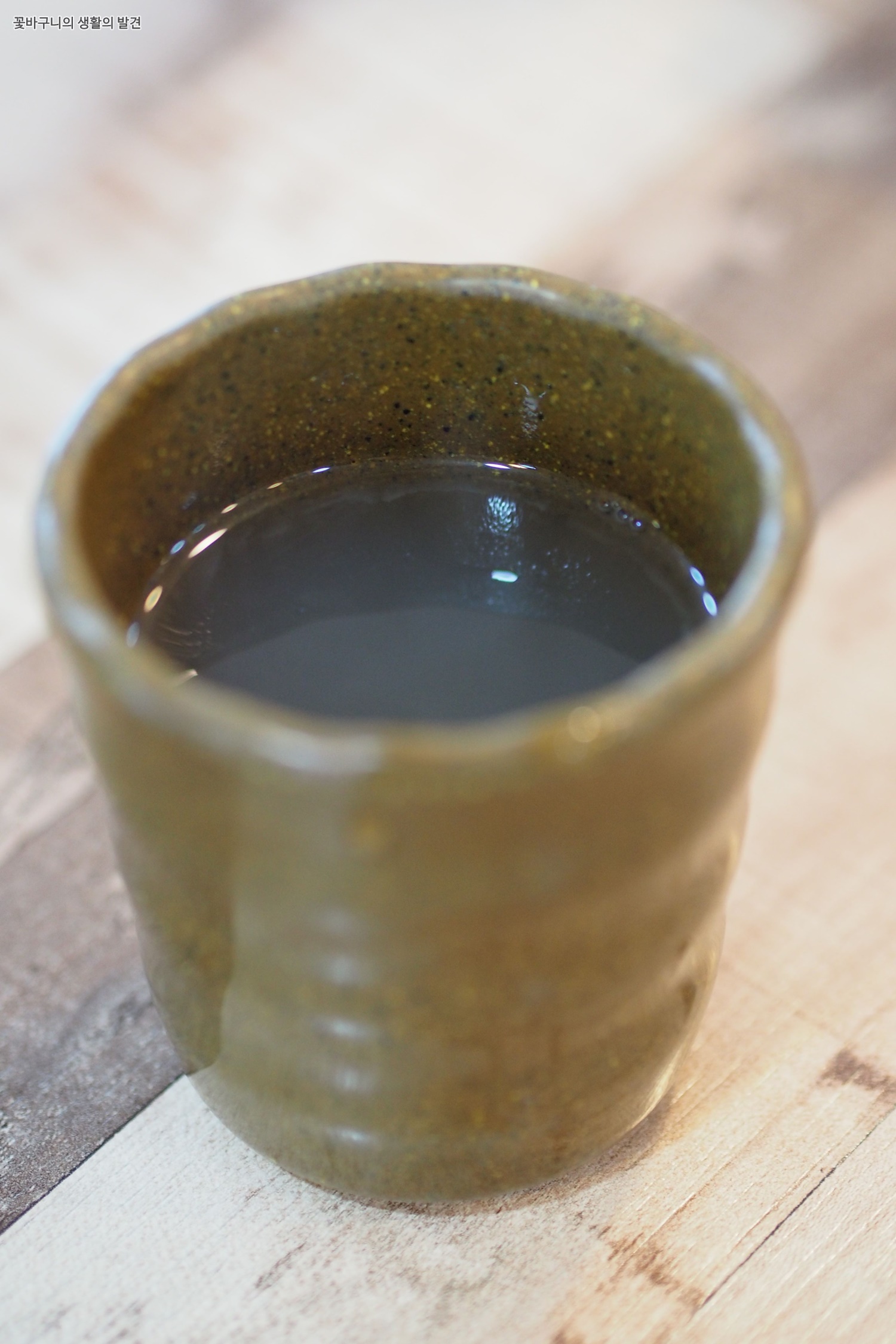 따뜻한 면수와 밑반찬이 세팅되었습니다. 따뜻한 면수는 쌀쌀한 날씨에 마시기 좋았고 새콤달콤한 무김치가 물냉면과 함께 먹으니 일반 냉면집의 무절임보다 훨씬 좋았습니다.