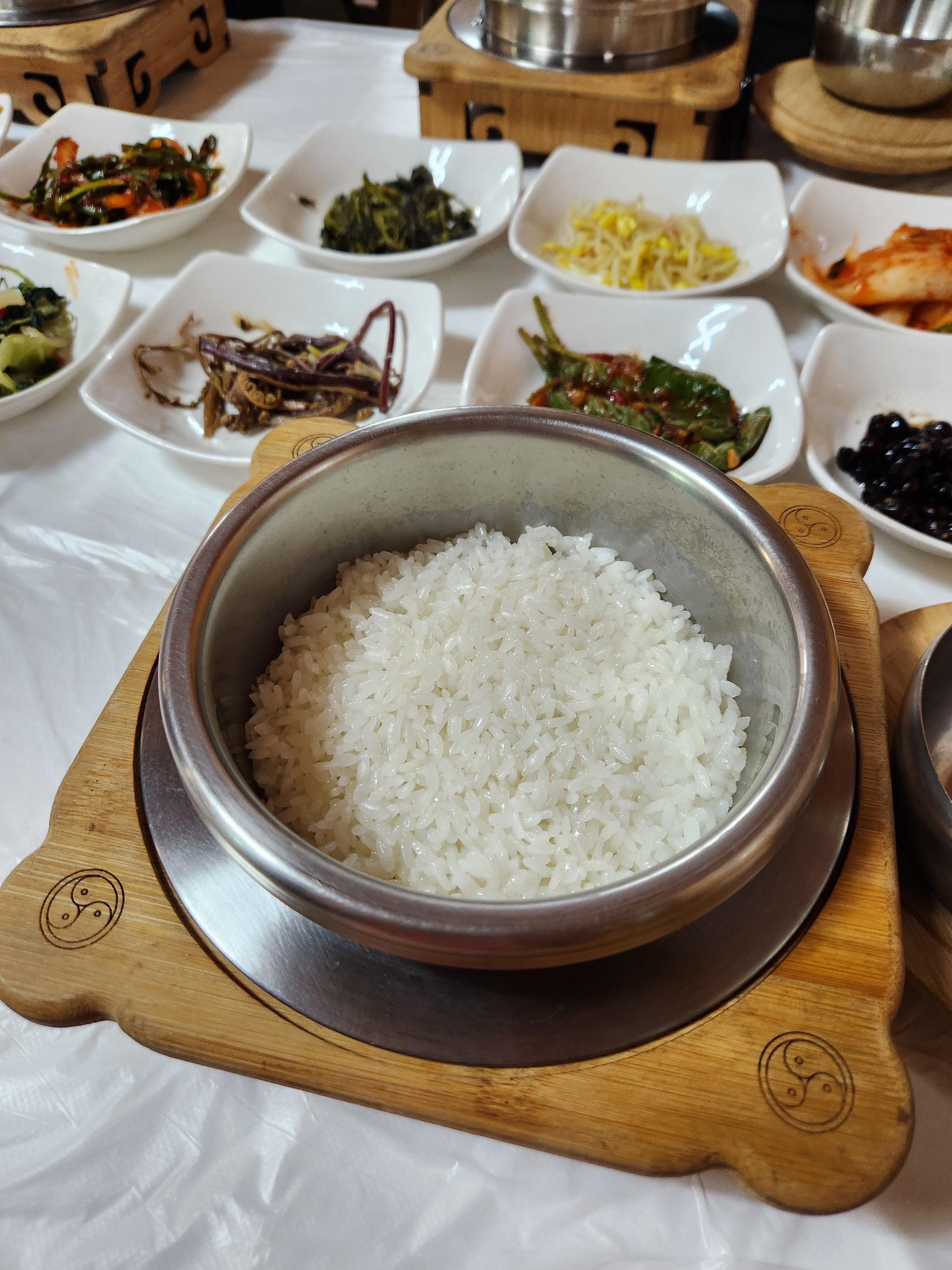 그렇게 한참을 기다리다 보니 드디어 황태정식이 나왔습니다. 황태정식은 돌솥이 아닌가? 돌솥으로 바꿔야 하나? 서로 이야기를 하는 중에 돌솥으로 나오니 어찌나 반갑던지요,, 윤기 흐르는 하냥 쌀밥은 반찬이 따로 필요 없을 정도로 맛있지요~ 거기에 물을 부어 누룽지까지~