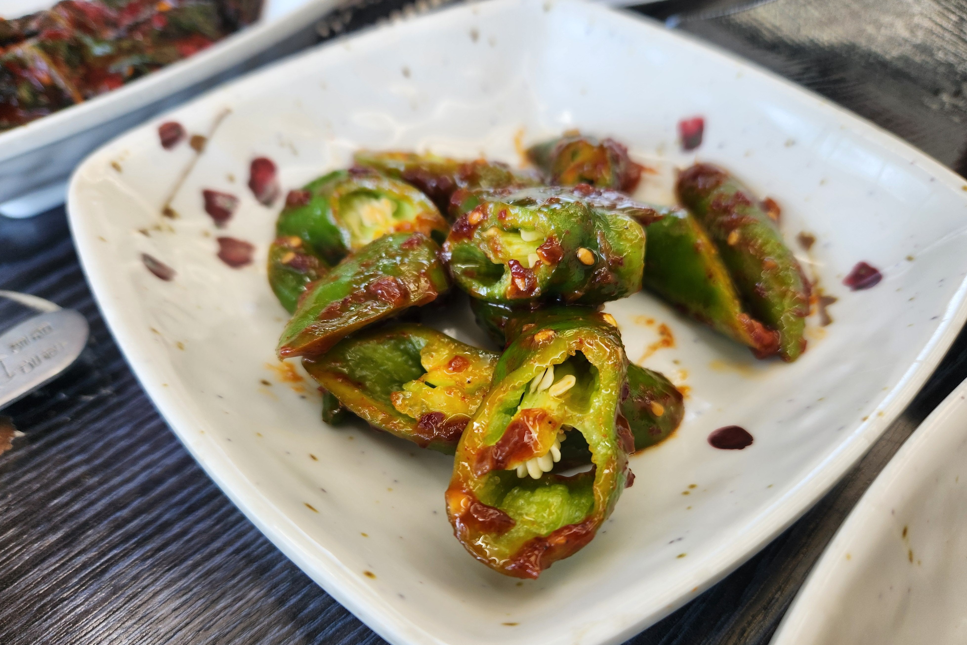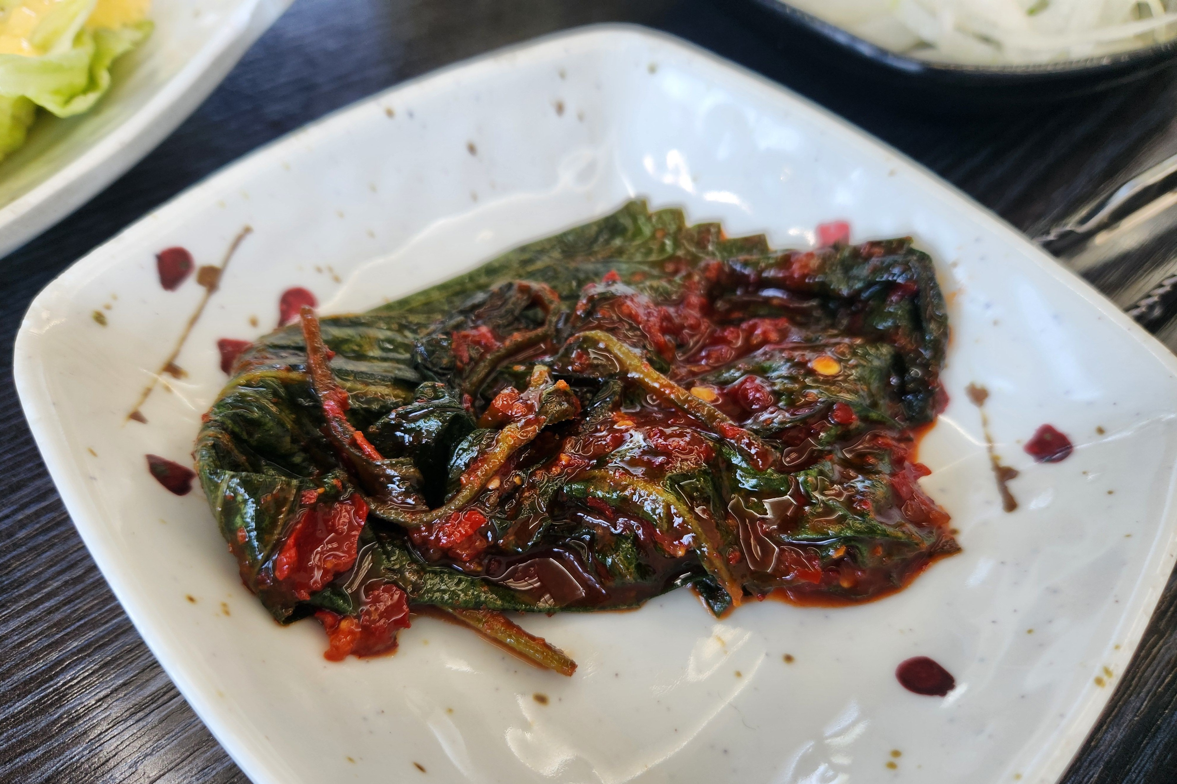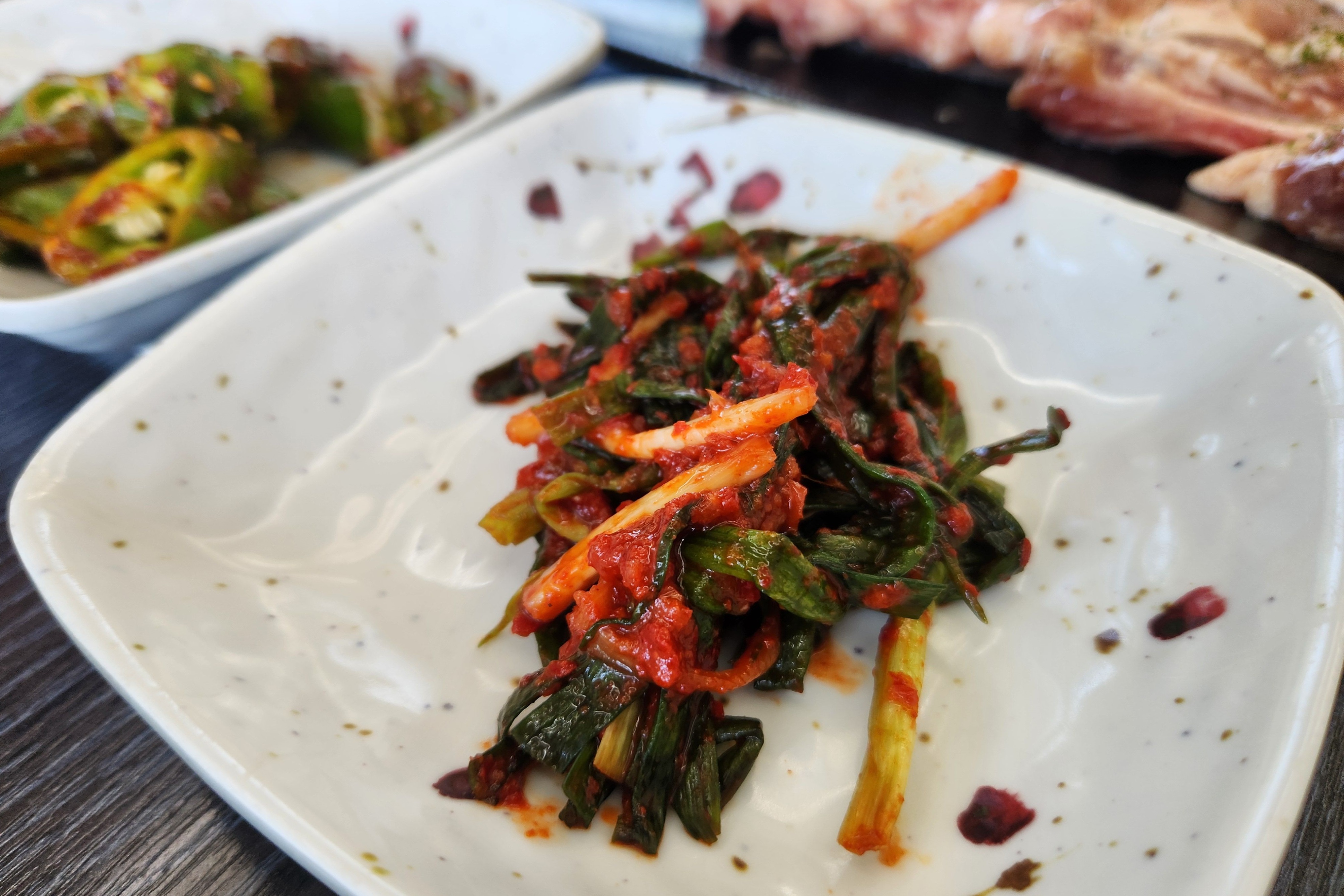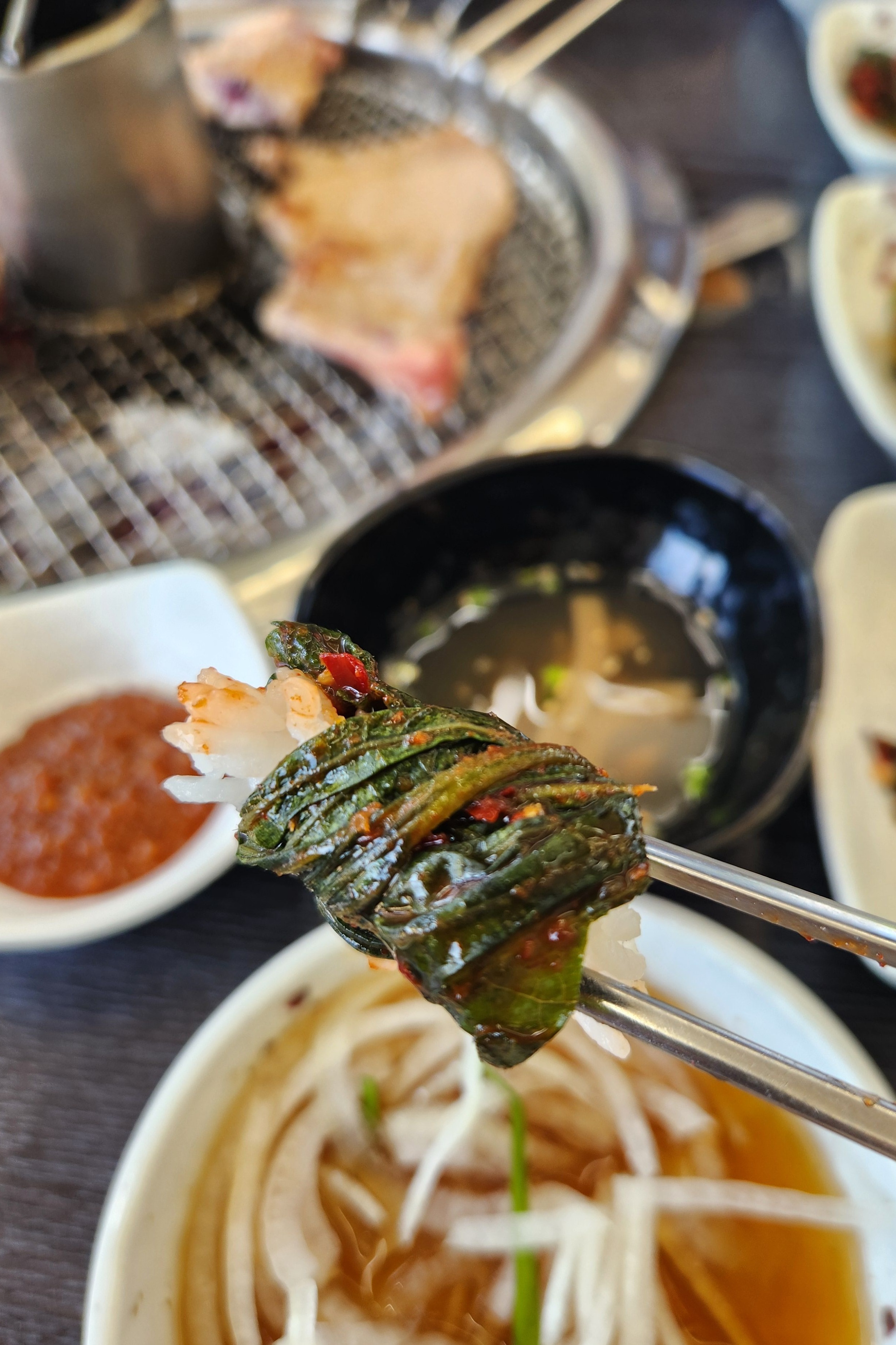 돼지갈비가 익는 동안 깻잎에 싸서 반 한 숟가락 먹어봤습니다, 아,,, 반찬들이 다 제 입에 딱입니다, 고기 먹기 전에 밥 한 공기 다 먹을 듯하더라고요,, 파김치며 고추무침, 장아찌가 밥반찬에 딱입니다.