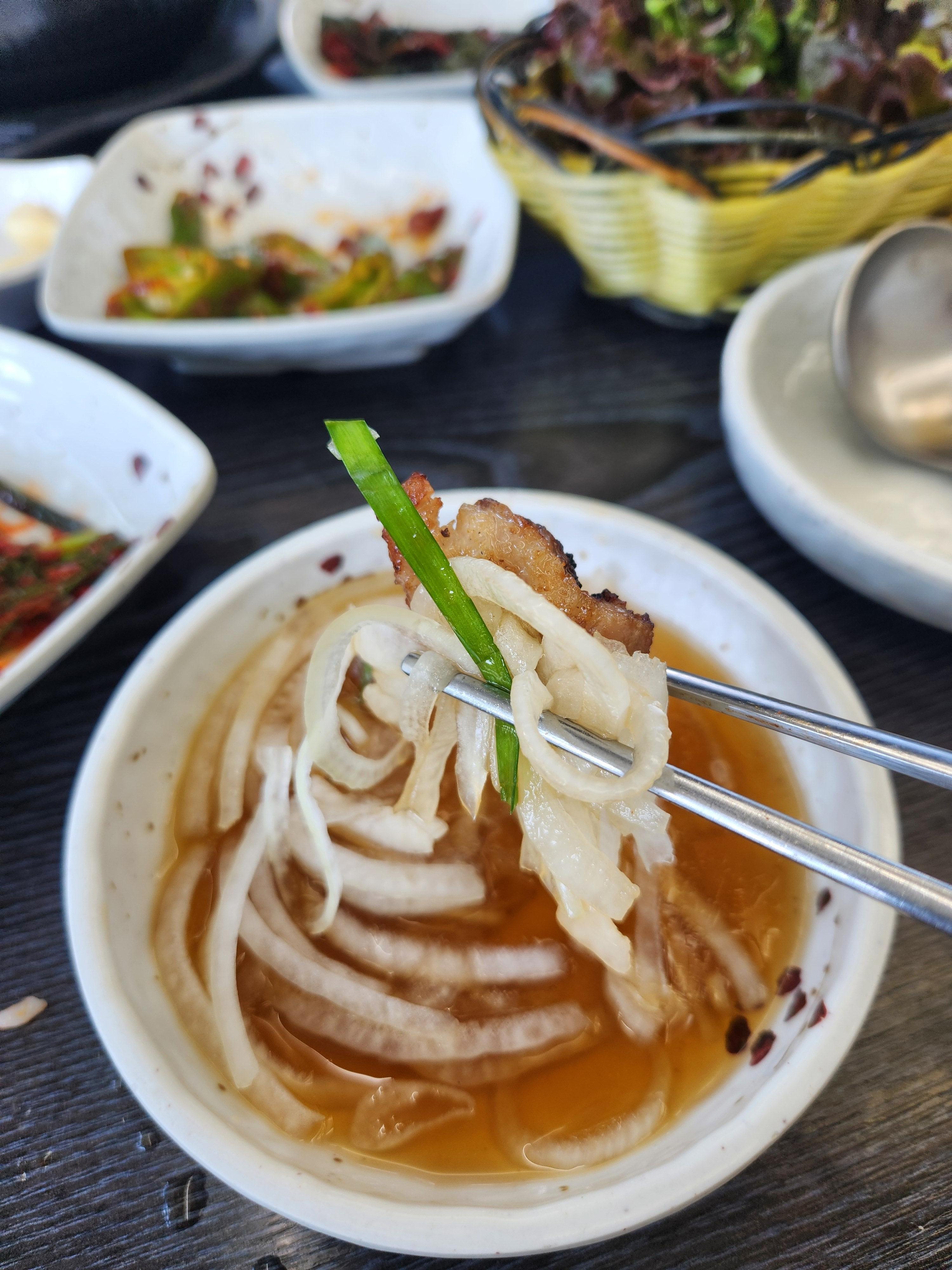 양념색이 진하지 않으니 자극적이지 않고 깔끔하면서 은은한 양념맛이 입안에 가득~ 감칠맛이 제대롭니다. 그냥 먹어도 맛있고 양파절임이나 상추에 취향껏 싸드셔요~ 어떻게 먹어도 참 맛있는 삼송가든 양념되지갈비입니다. 전,, 그냥 먹는 게 젤 맛있더라고요. 은근달달 짭조름한 게 자꾸 생각나는 맛입니다.