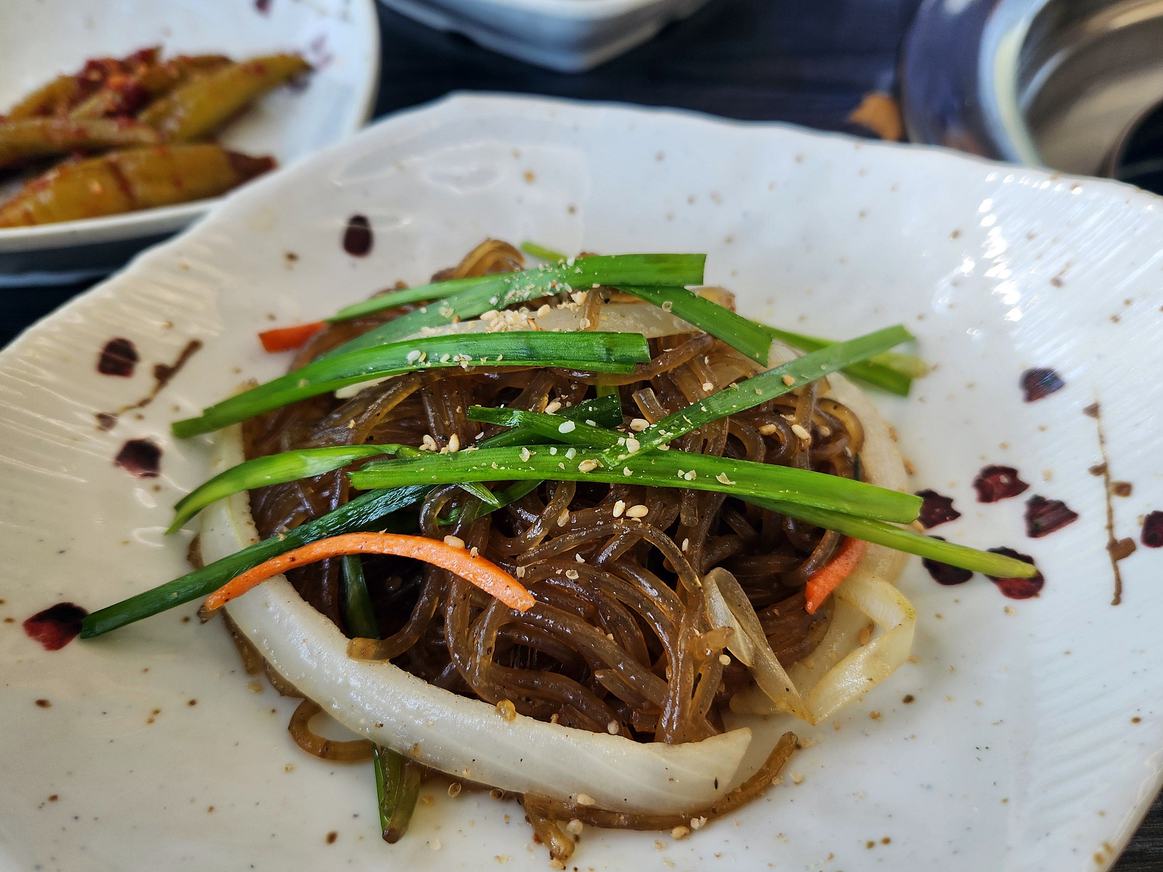 수제양념되지갈비를 주문하고 기다리는 동안 밑반찬이 나왔습니다, 밑반찬을 보니 그냥 반찬에 밥 한 공기 뚝딱 먹을 수 있는 반찬들로 아주 맘에 들었습니다. 돼지갈비가 익기를 기다리는 동안 된장찌개에 공깃밥으로 밑반찬들 맛을 보았습니다. 잡채가 대부분 미리 만들어 놔서 차갑게 식어 내주는데 이곳 삼송가든은 따뜻하게 나오니 더 맛있더라고요~