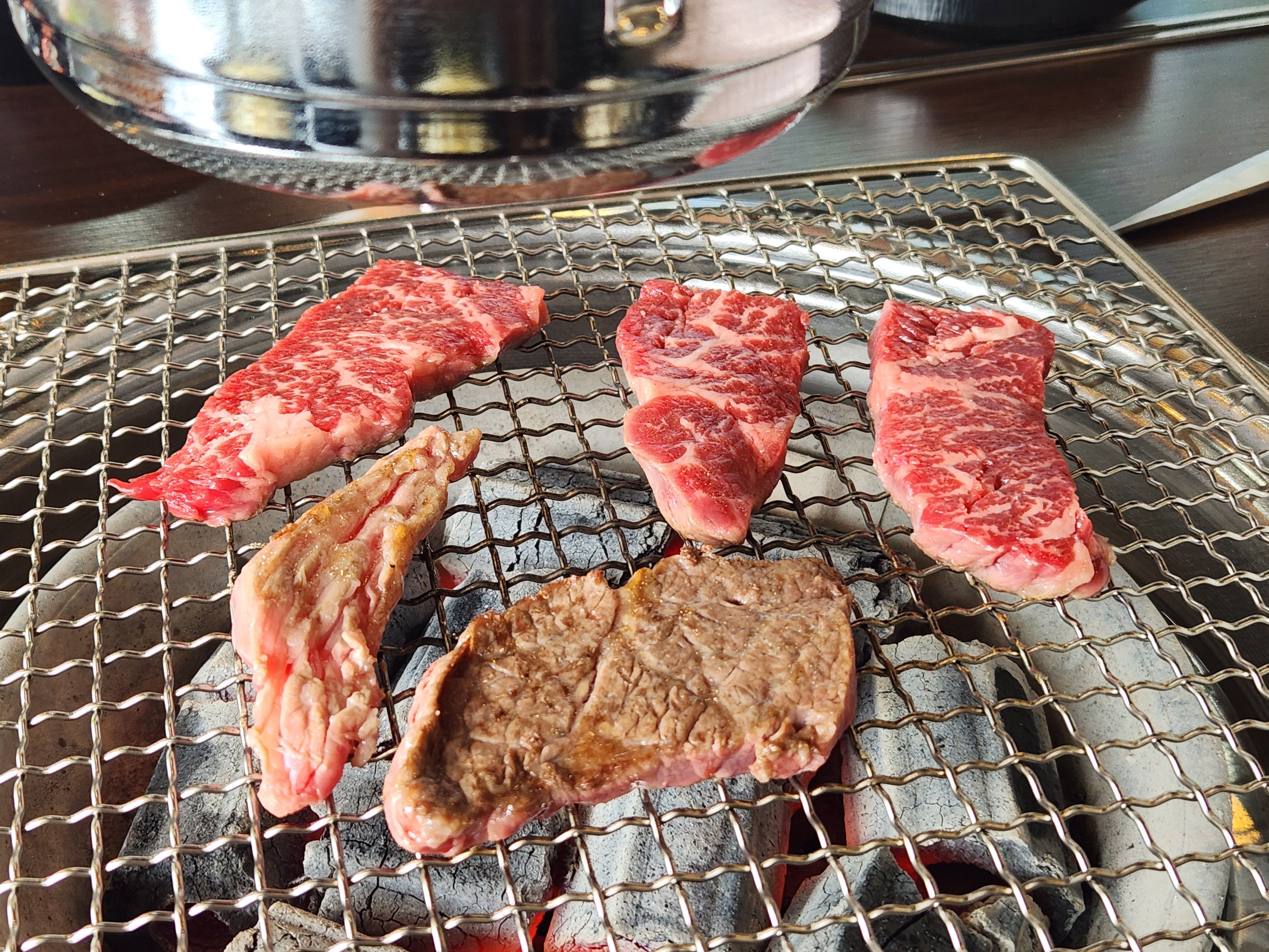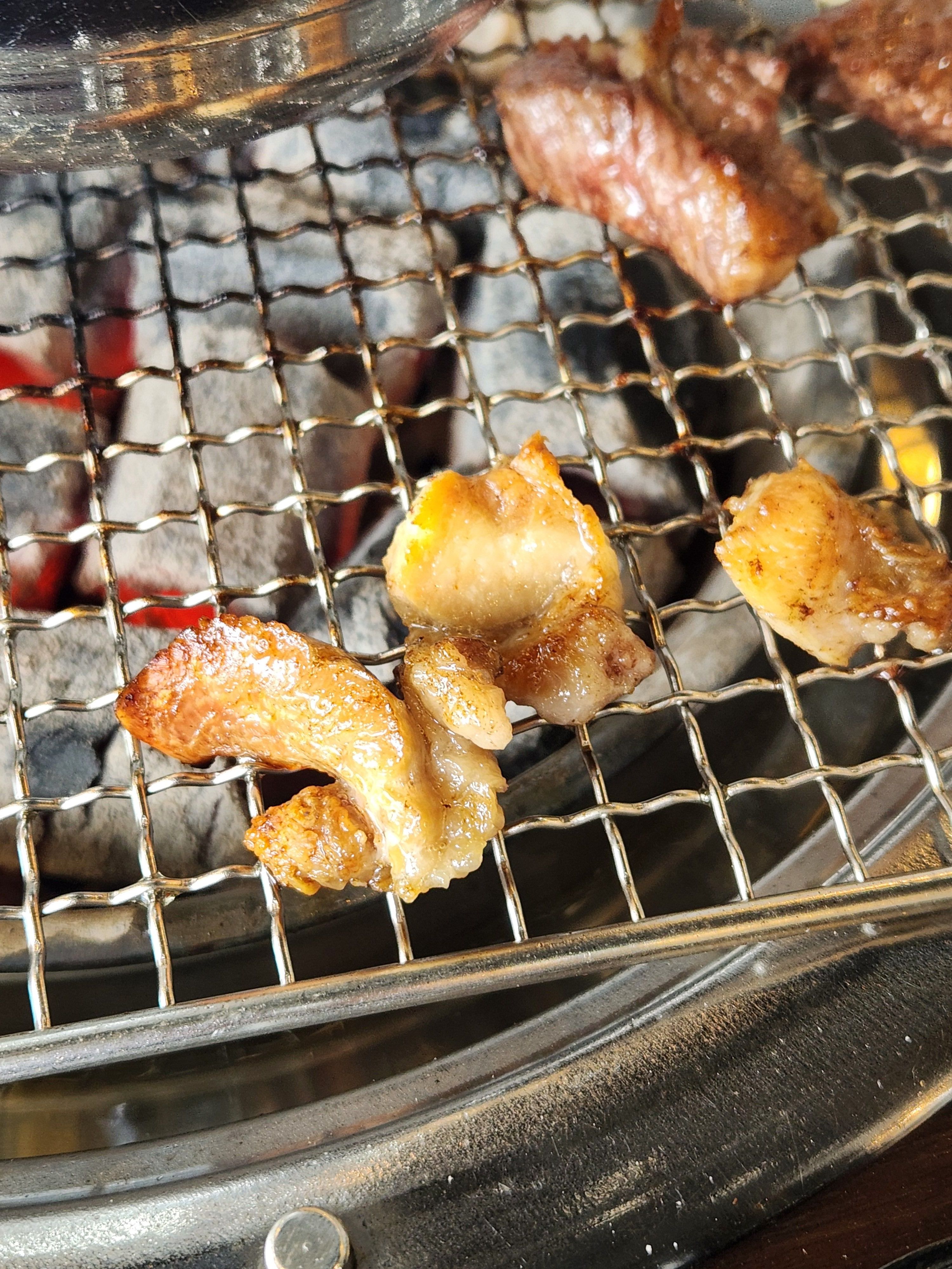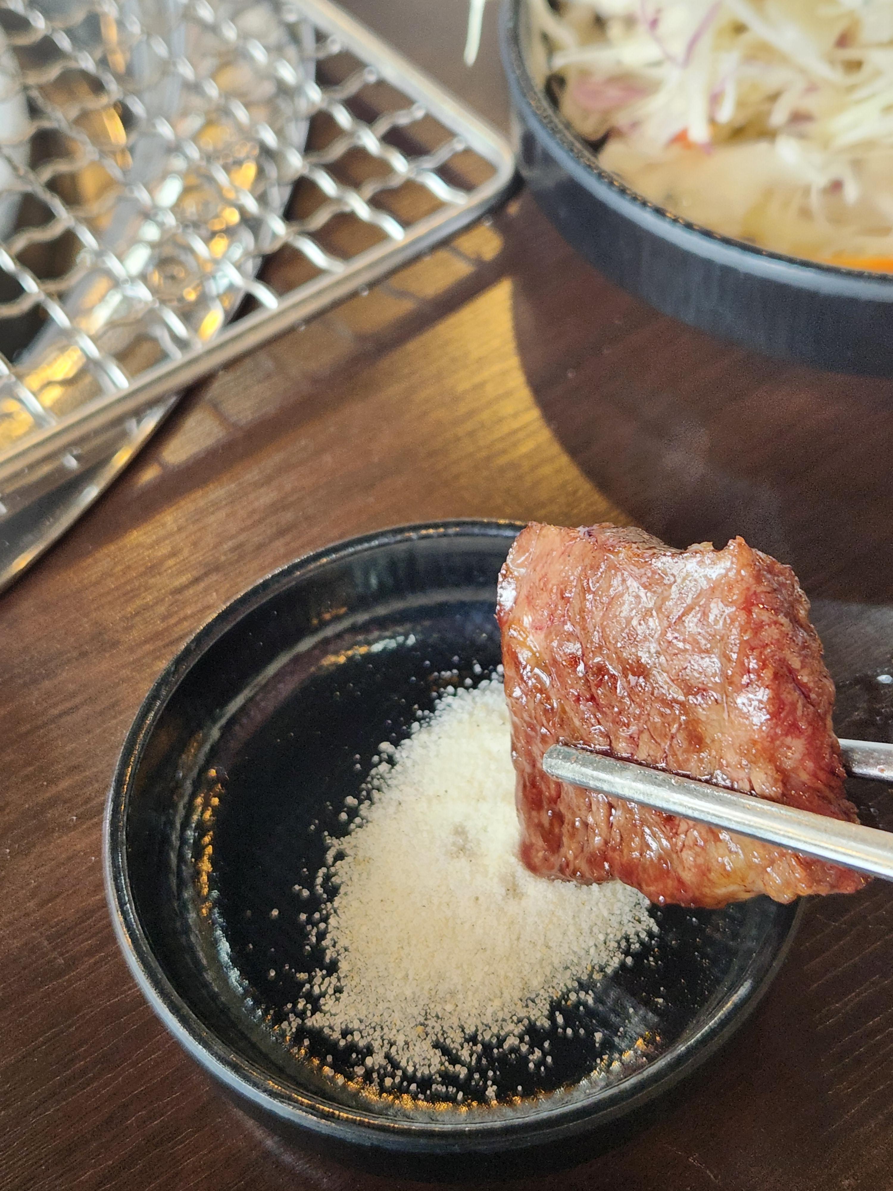 고기를 선택 후 자리에서 잠시 기다리면 바로 숯불을 올려주십니다. 숯불이 올려지자 마자 살치살 부터 구워봤습니다.적당히 익었을때쯤 소금만 찍어 먹었답니다. 부드럽고 육즙 가득한 살치살과 등심이 정말 맛있더라구요~