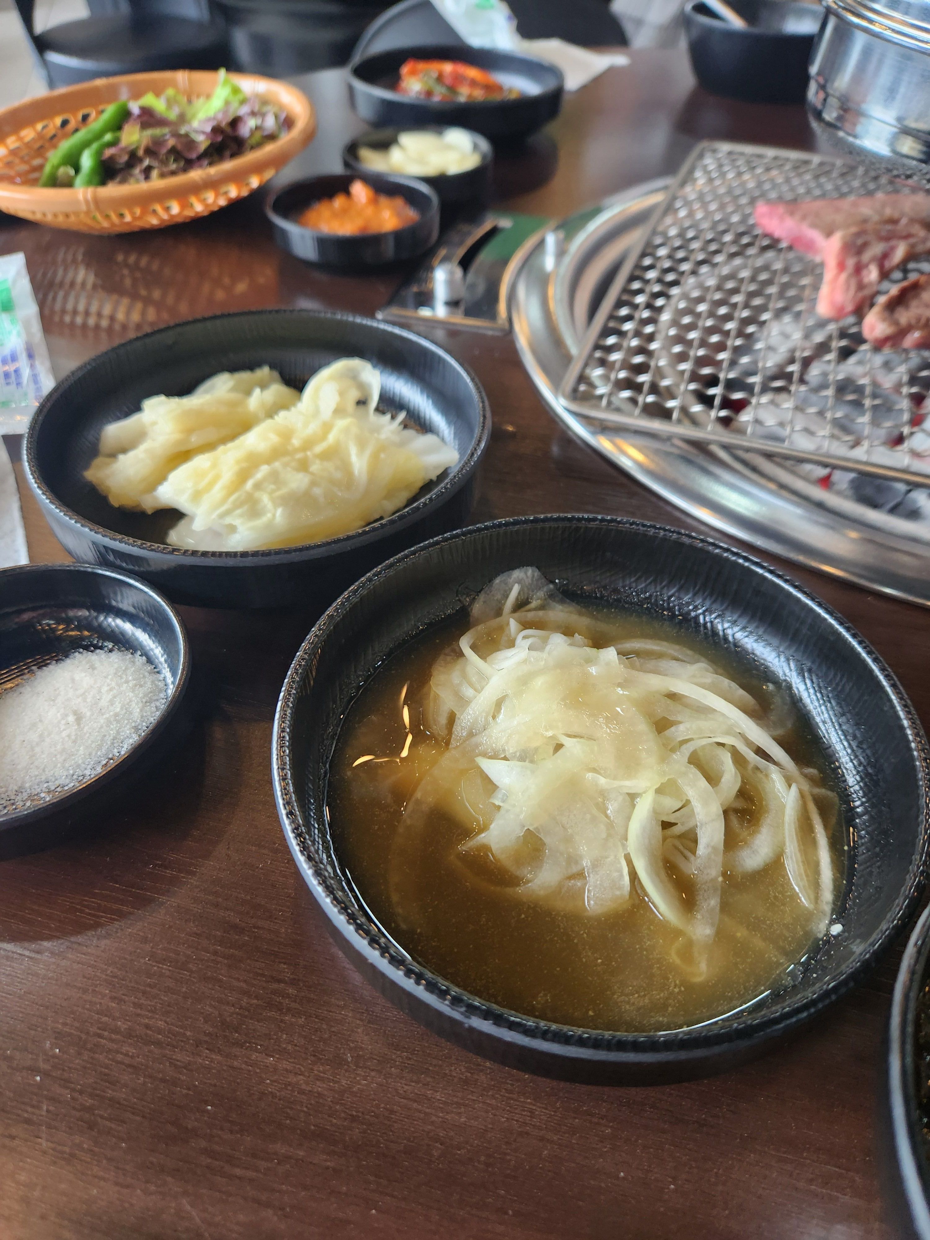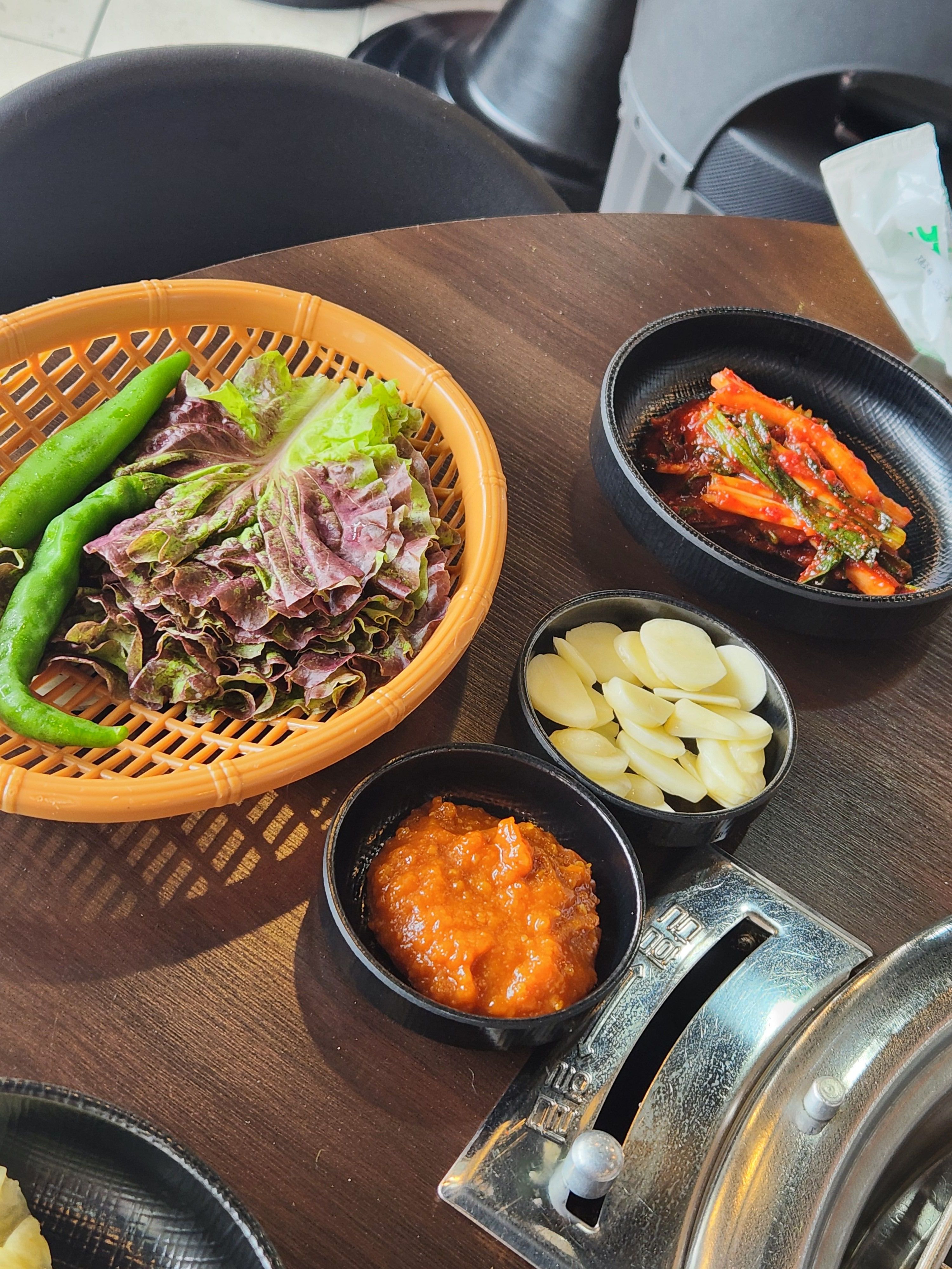 딱 먹을 것들로만 구성된 기본찬은 양배추 샐러드.양파절임,파김치,백김치,쌈채소,마늘,소금을 세팅해 주십니다.