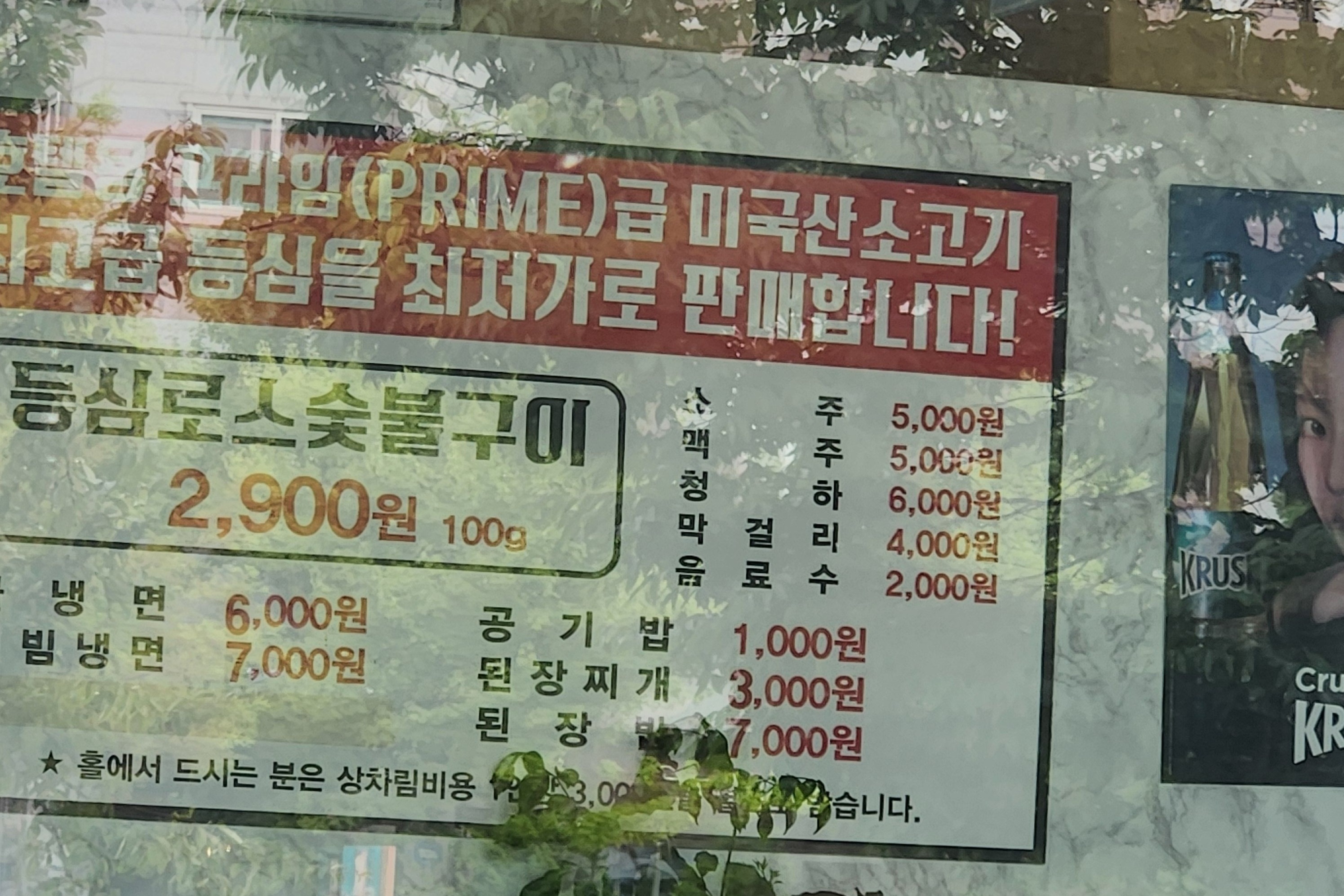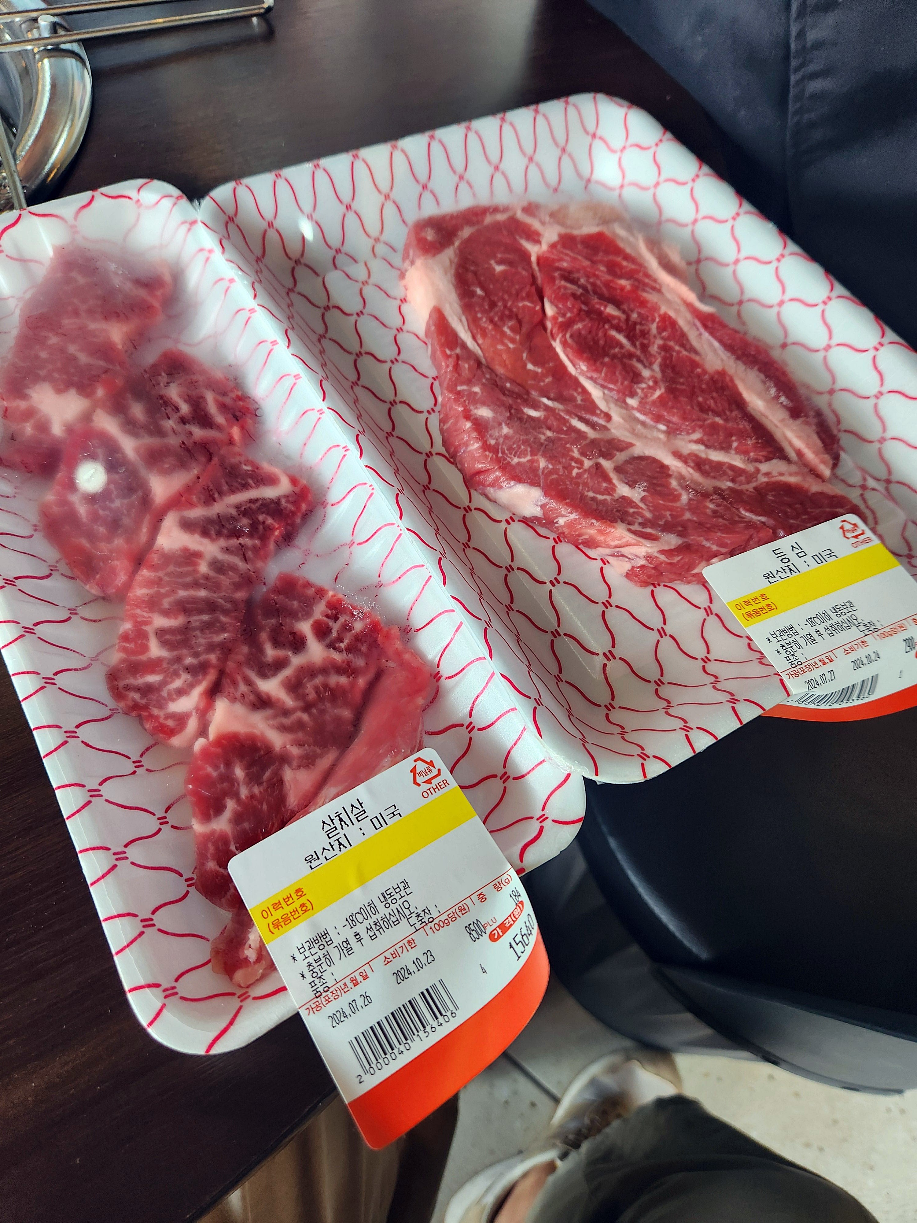 호텔용 프라임급의 미국산 소고기 등심로스는 100g에 2,900원이라는 놀라운 가격~ 커다란 등심이 만원이 채 되지 않는 아주 합리적인 가격에 만나실 수 있답니다~ 저희는 등심과 살치살을 골랐습니다. 이렇게 두팩 합쳐도 26,000원정도이면 정말 대박이지 않나요? 가져온 고긱의 가겨표는 빌지에 붙이고 다 드시고 나갈실때 계산하시면 됩니다.