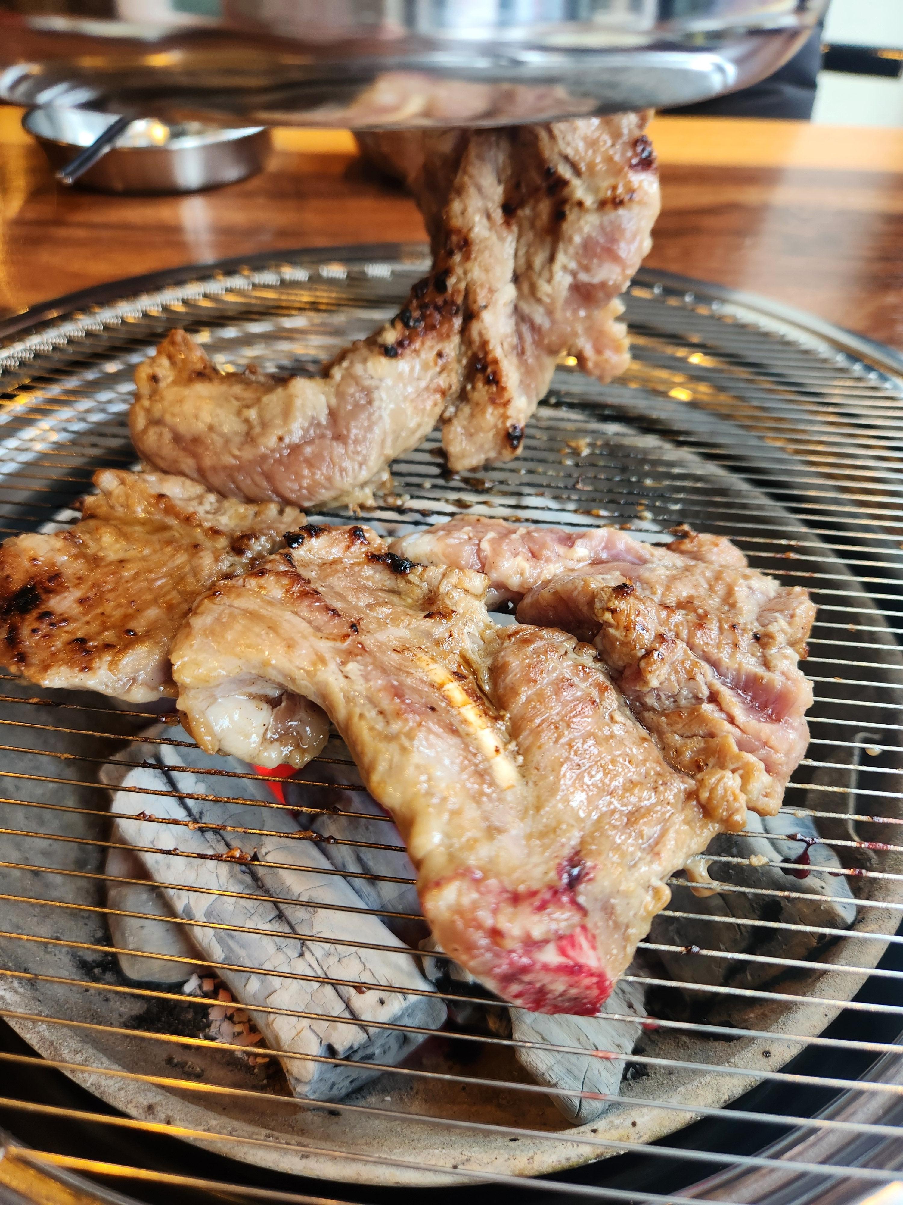 보통 돼지갈비보다 살짝 두툼한 느낌의 돼지갈비였습니다. 불판 위에서 치익 소리를 내며 익어 가는 고기는 숯불향이 은은하게 배어 들면서 그 고소한 냄새가 정말 참기 힘들었습니다.