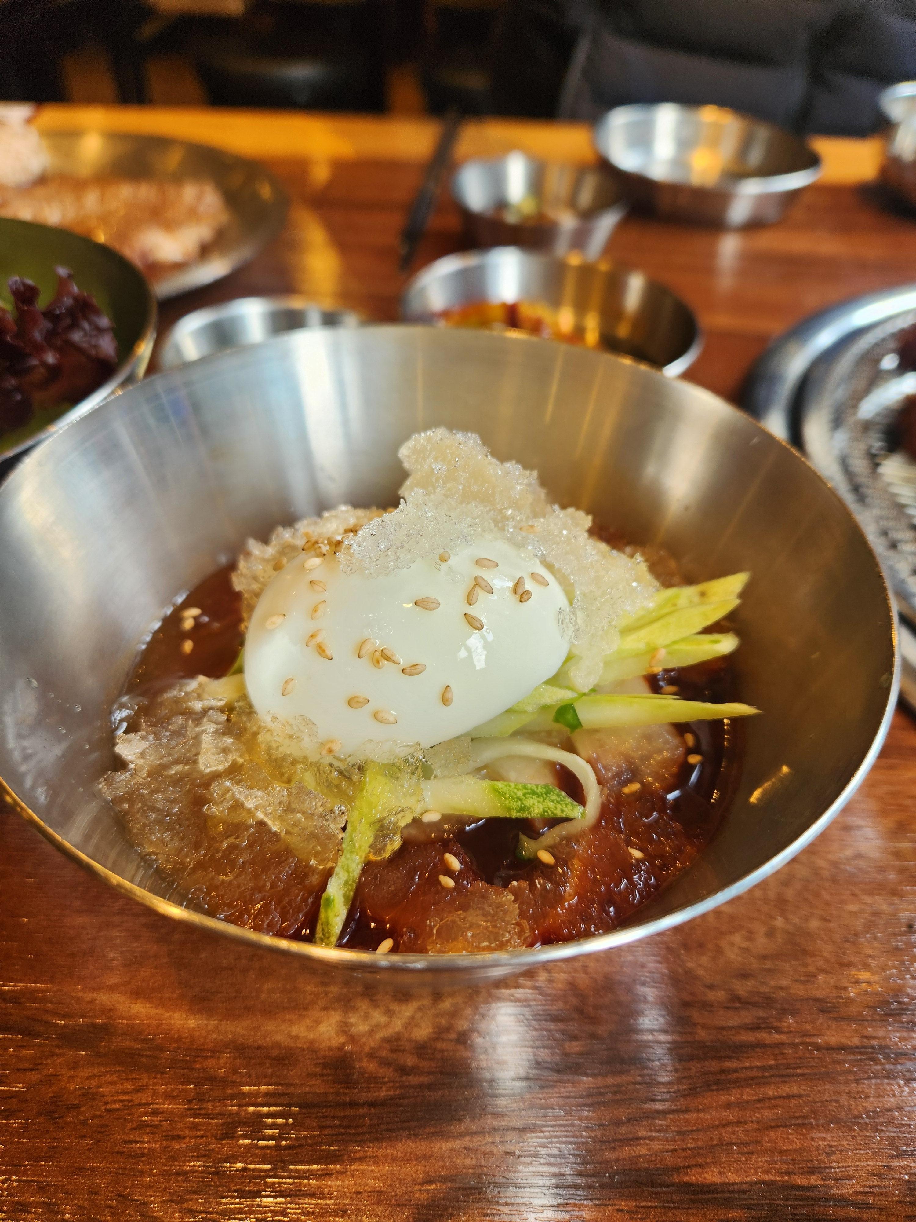 고깃집에서 빼놓을 수 없는 후식메뉴인 냉면. 후식메뉴답게 정말 적은 양입니다. 사진엔 엄청 크게 나왔네요.. 시원한 냉면 육수에 쫄깃한 면발과 새콤달콤한 양념이 어우러져 돼지갈비로 든든하게 채운 배에 개운함을 더해 주고 깔끔하게 마무리하기 좋은 메뉴였습니다.