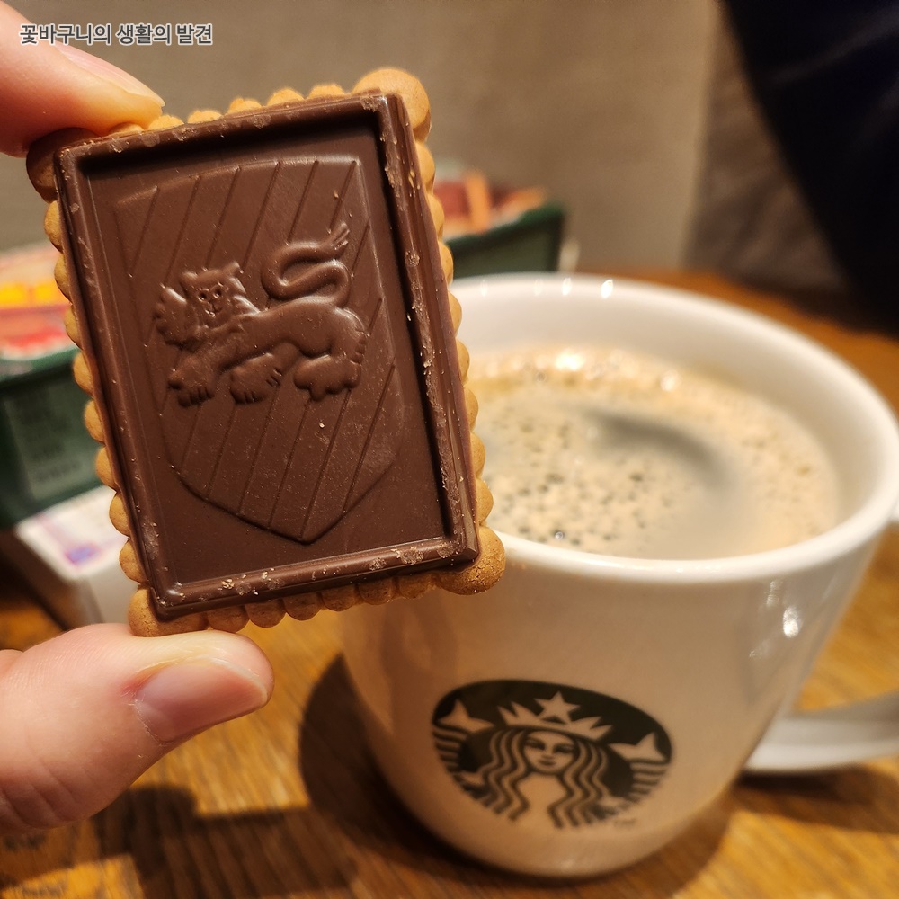 특히 커피나 홍차, 티 등 어떤 음료와 함께 즐겨도 맛있을 것 같은 맛이어서 따뜻한 스타벅스 아메리카노와 함께했습니다. 비스킷의 진한 달콤함과 아메리카노의 깔끔한 쌉쌀함이 만나니, 달콤함이 더욱 깊어지고 쌉쌀함은 부드러워지고 너무 달기만 한 느낌을 없애주었습니다.