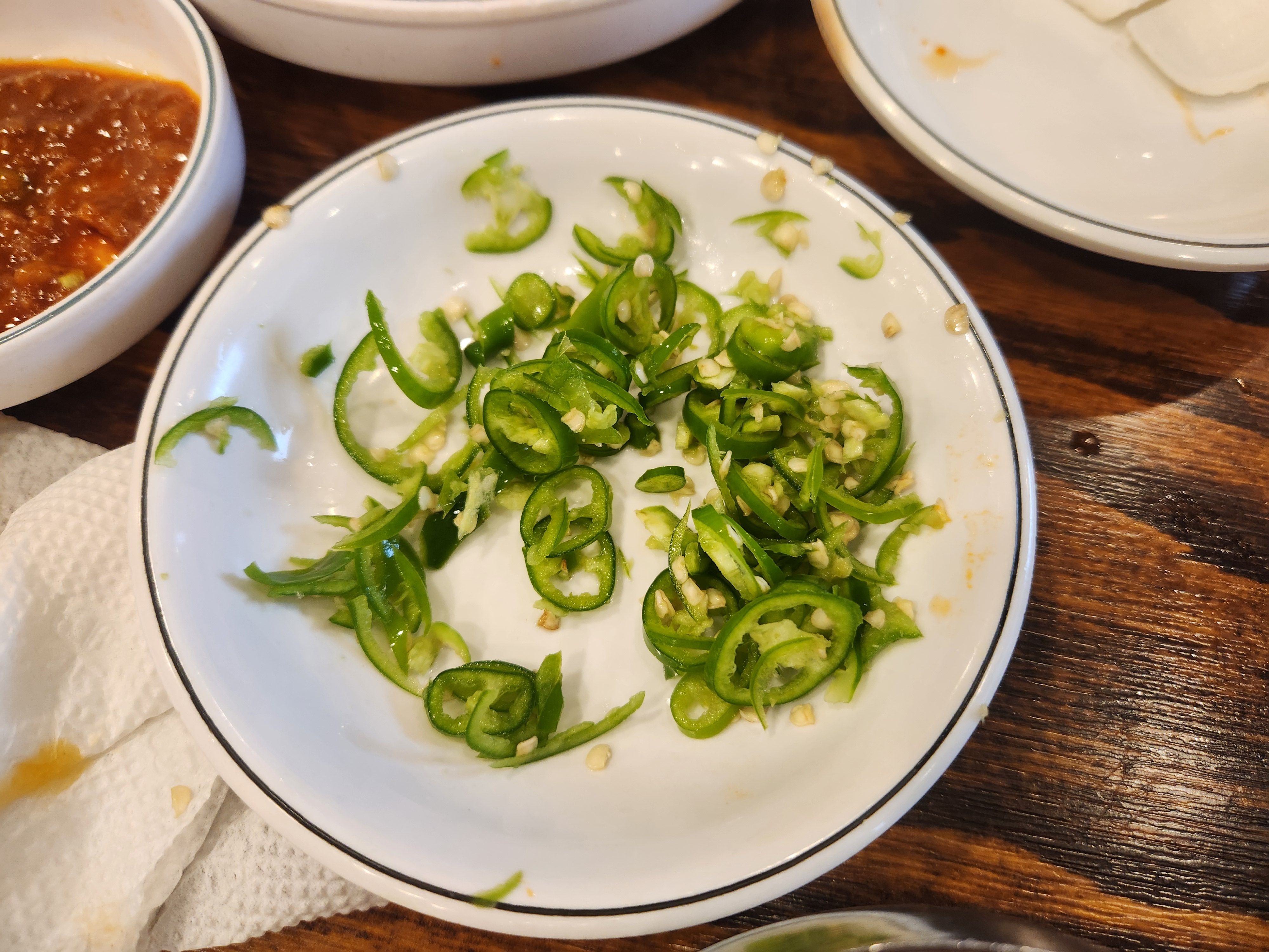사진이 좀 지저분,, ㅋㅋ (일행들이 다 퍼가고 찍은 사진이라,,) 청양고추는 달라고 하면 가져다주시는데 다진 것을 원하는지 그냥 찍어 먹을 것을 원하는지 물어보시고는 저희가 원하는 다진 것을 듬뿍 가져다주셨습니다.