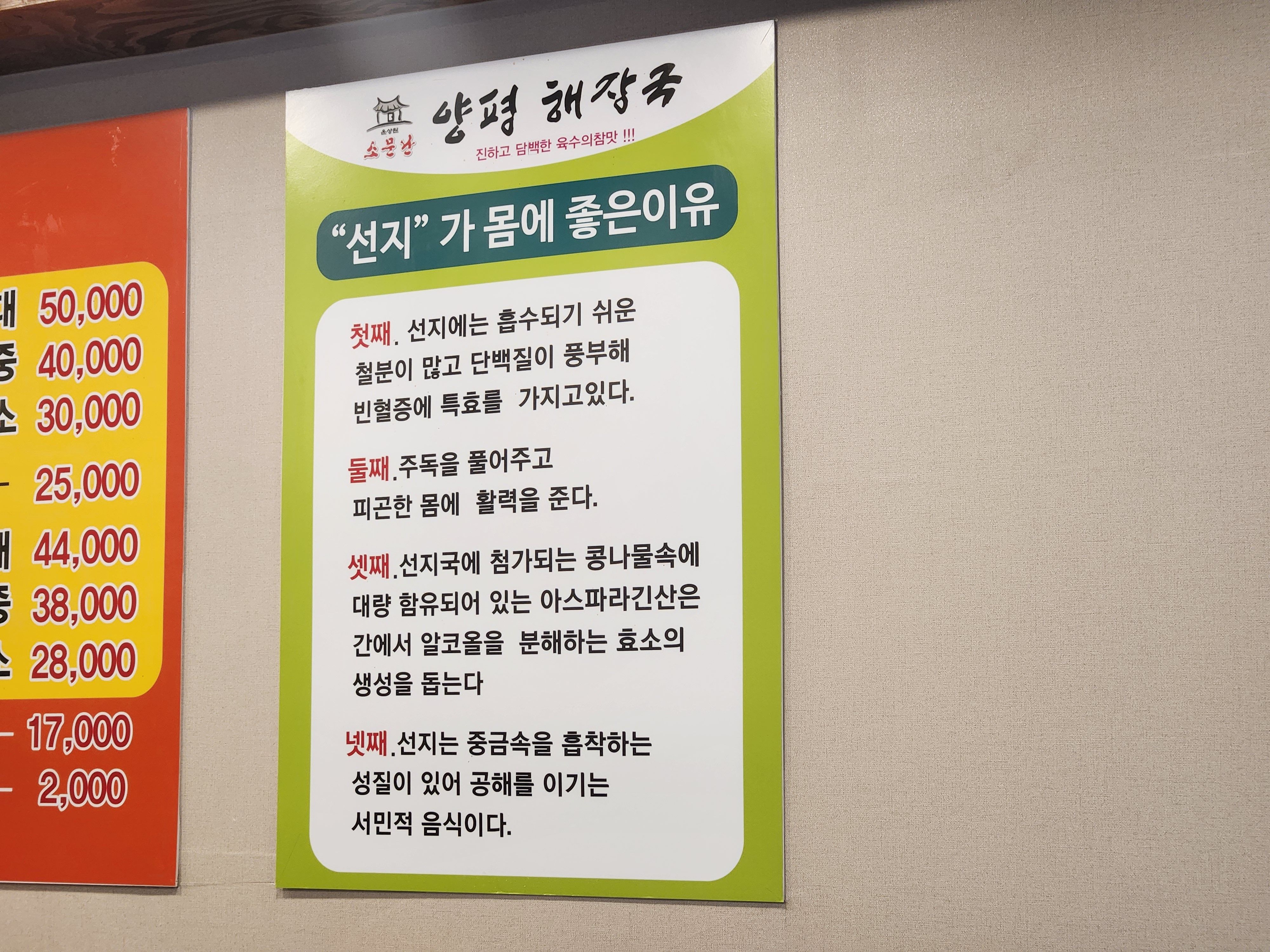 양평해장국에도 선지가 조금 들어가는데 선지가 몸에 좋은 건 다 알고 계시죠~ 철분과 단백질이 많아 빈혈증에 특효가 있다고 해서 저도 일부러라도 가끔씩 먹어주곤 합니다.