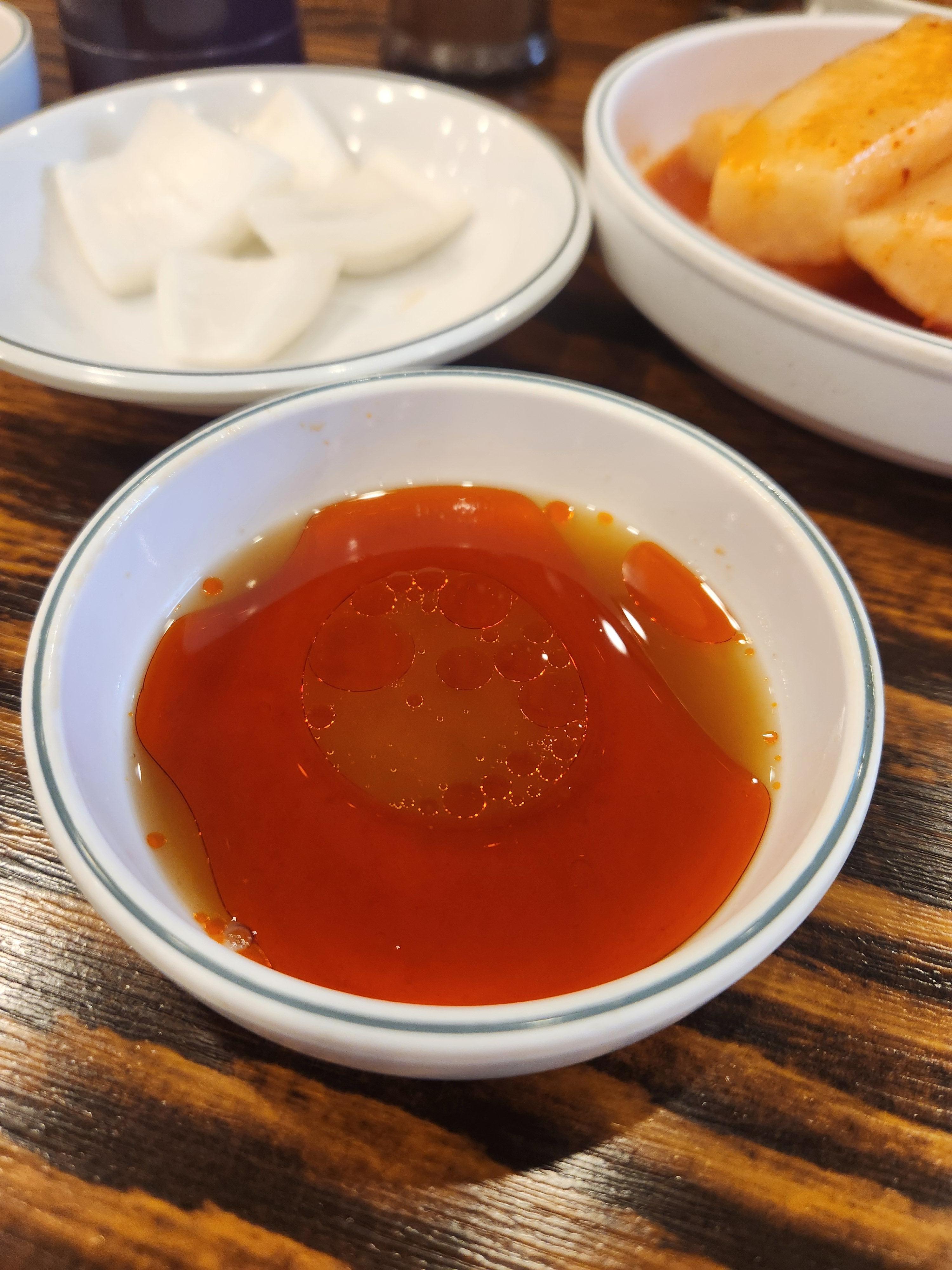 함께 나오는 간장소스에 고추기름을 섞어주었습니다. 테이블에 고추기름과 후추, 들깨가루는 준비되어 있고 테이블에 소스 만드는 방법도 적혀 있으나 취향껏 조절해서 드시면 될 것 같아요,, 저는 개인적으로 들깨는 텁텁해져서 넣지 않는 걸 선호합니다.