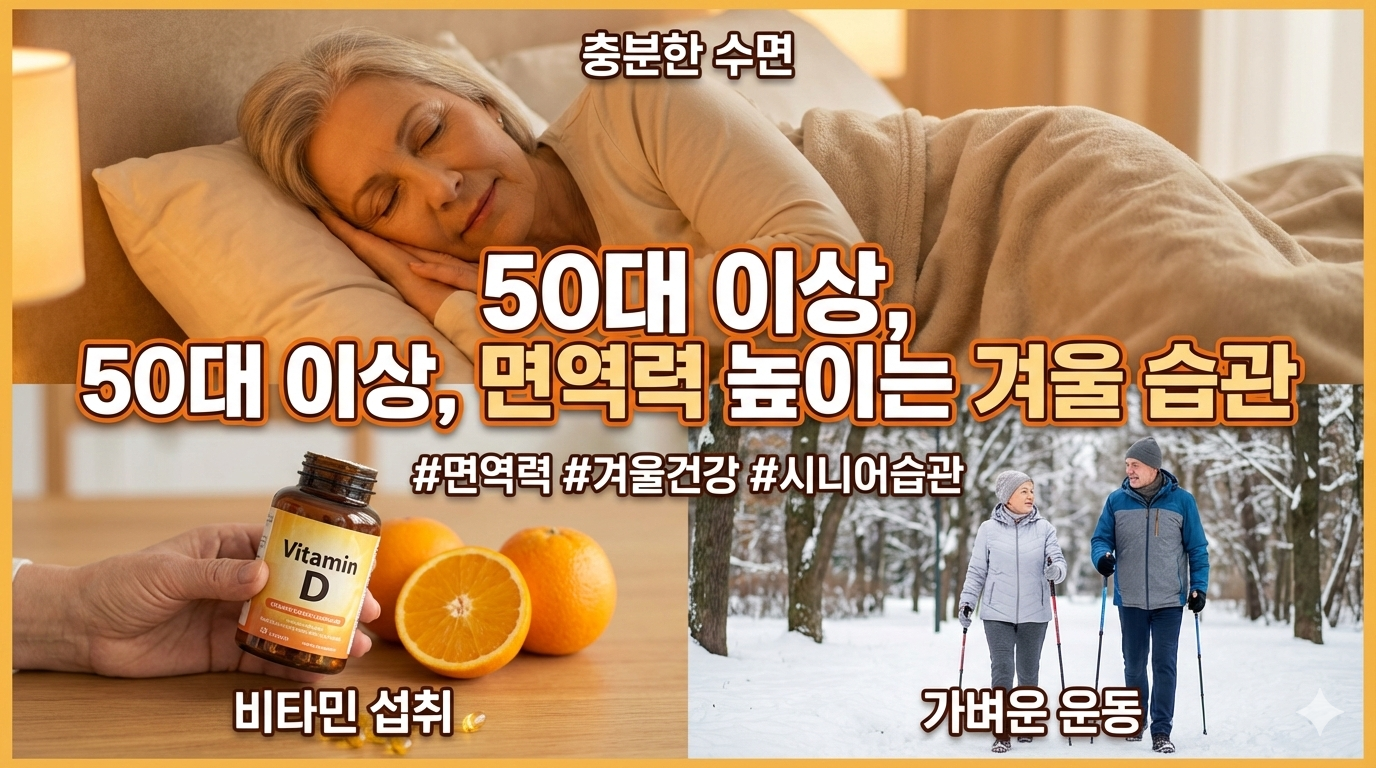 우리 몸의 방어막인 면역력은 50대를 기점으로 완만한 곡선을 그리며 감소하기 시작합니다. 특히 겨울에는 체온 유지를 위해 에너지를 많이 소모하기 때문에 면역 세포의 활동이 위축되기 쉽습니다.50대 이상 시니어 분들의 면역력을 튼튼하게 지켜줄 세 가지 핵심 습관, 바로 숙면, 비타민 섭취, 규칙적인 운동에 대해 자세히 알아보겠습니다.